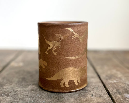 Many of the pots in this show are coated with terra sigillata; a clay slip made by letting clay settle in water, then siphoning off only the finest particles that float in the middle of the mix. This creates a thin white slip with a soft sheen that covers over my dark clay, while still allowing the surface of the clay, and some its color, to show through. I created divisions on the pots like windows that reveal some pieces of what's beneath the surface and obscure others. I filled them with silk-screened and painted underglaze, and with decal images of patterns and textures.