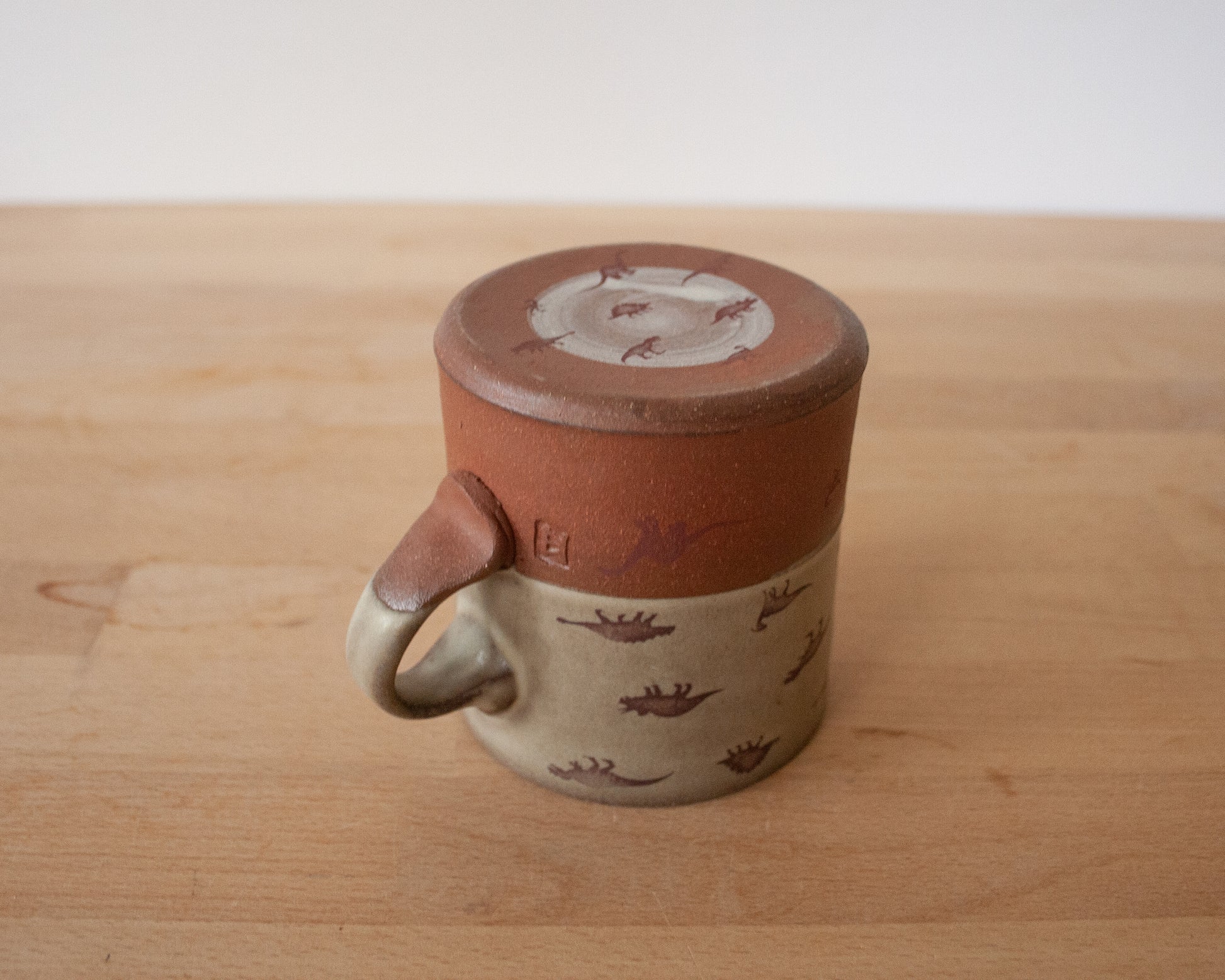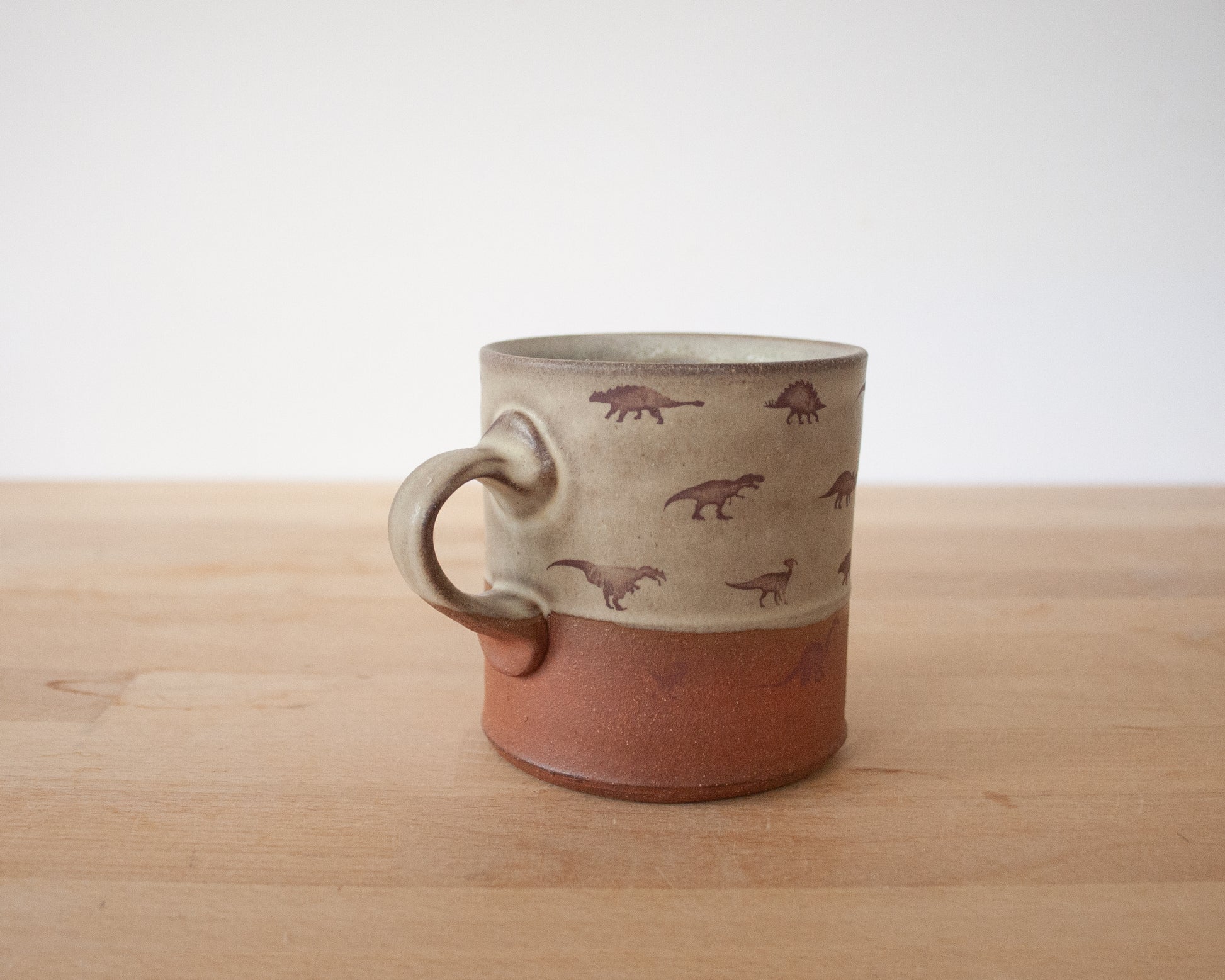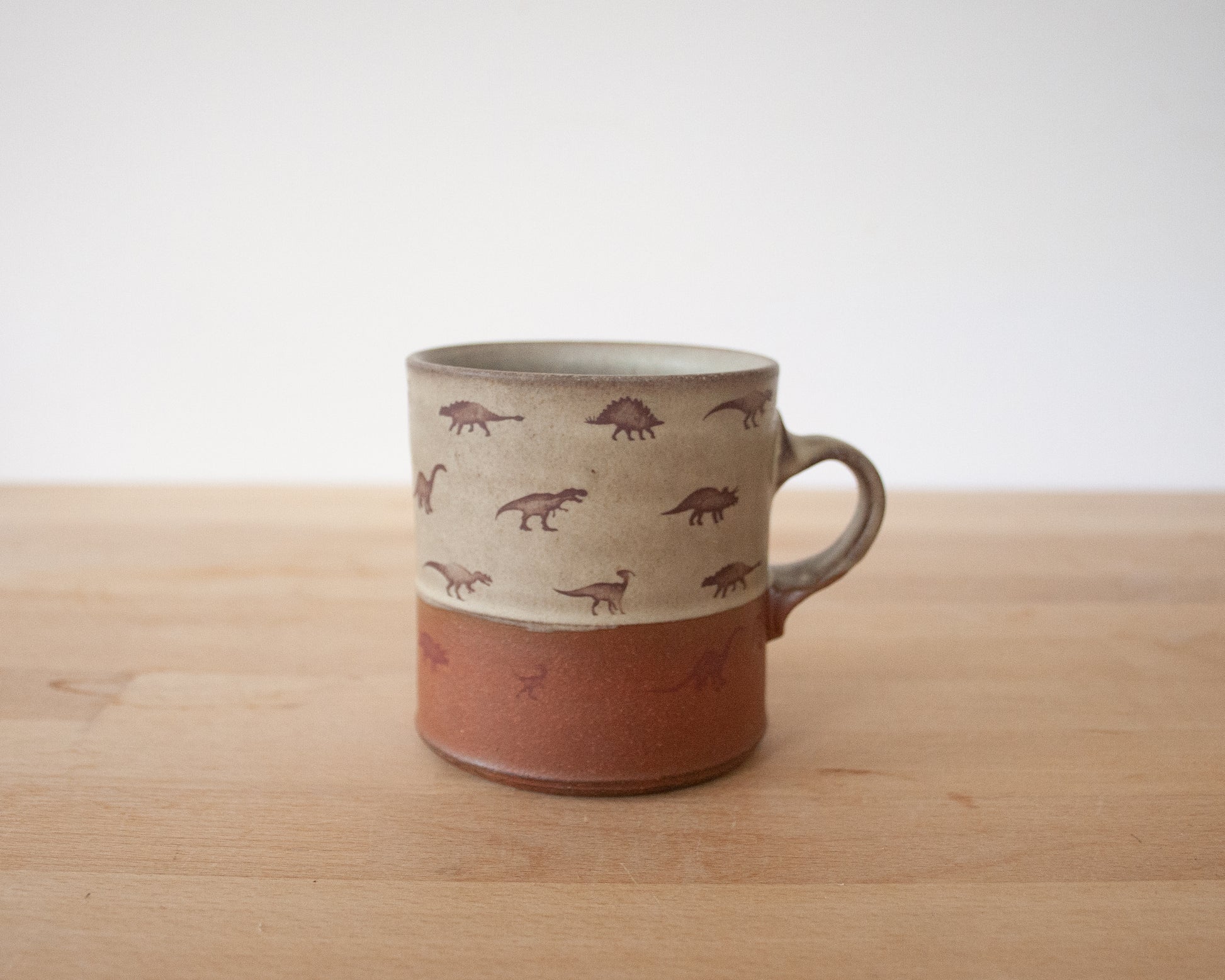 This handmade, wheel thrown mug has a design of small dinosaurs that have been fired into the glaze. The bottom section is left unglazed, and the matte raw red clay complements the smooth glazed surface of the top and interior of the mug. It also has dinosaurs on the bottom of the mug.
