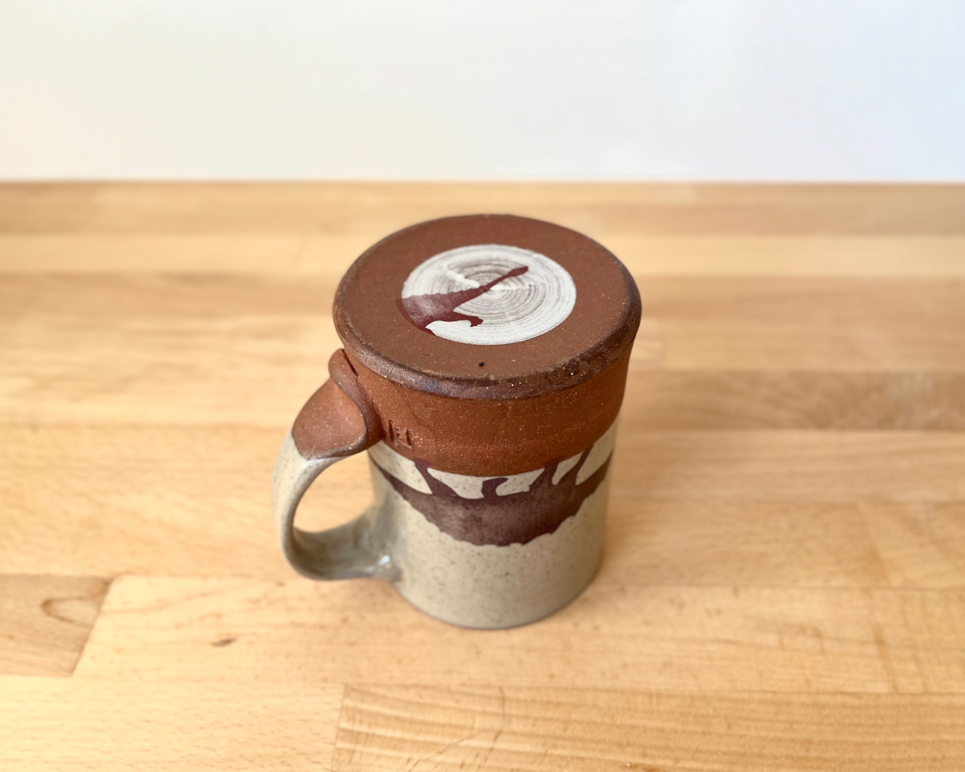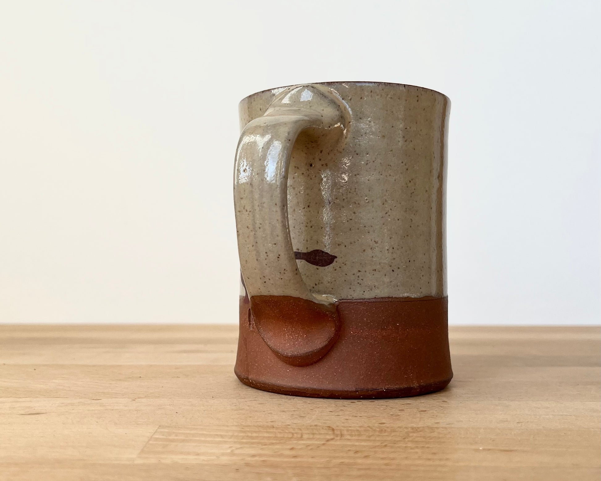 This handmade, wheel thrown mug has yellow glaze and a ankylosaurus design that has been fired into the glaze. The bottom section is left unglazed, and the matte raw red clay complements the smooth glazed surface of the top and interior of the mug. It also has a ankylosaurus tail on the bottom of the mug.