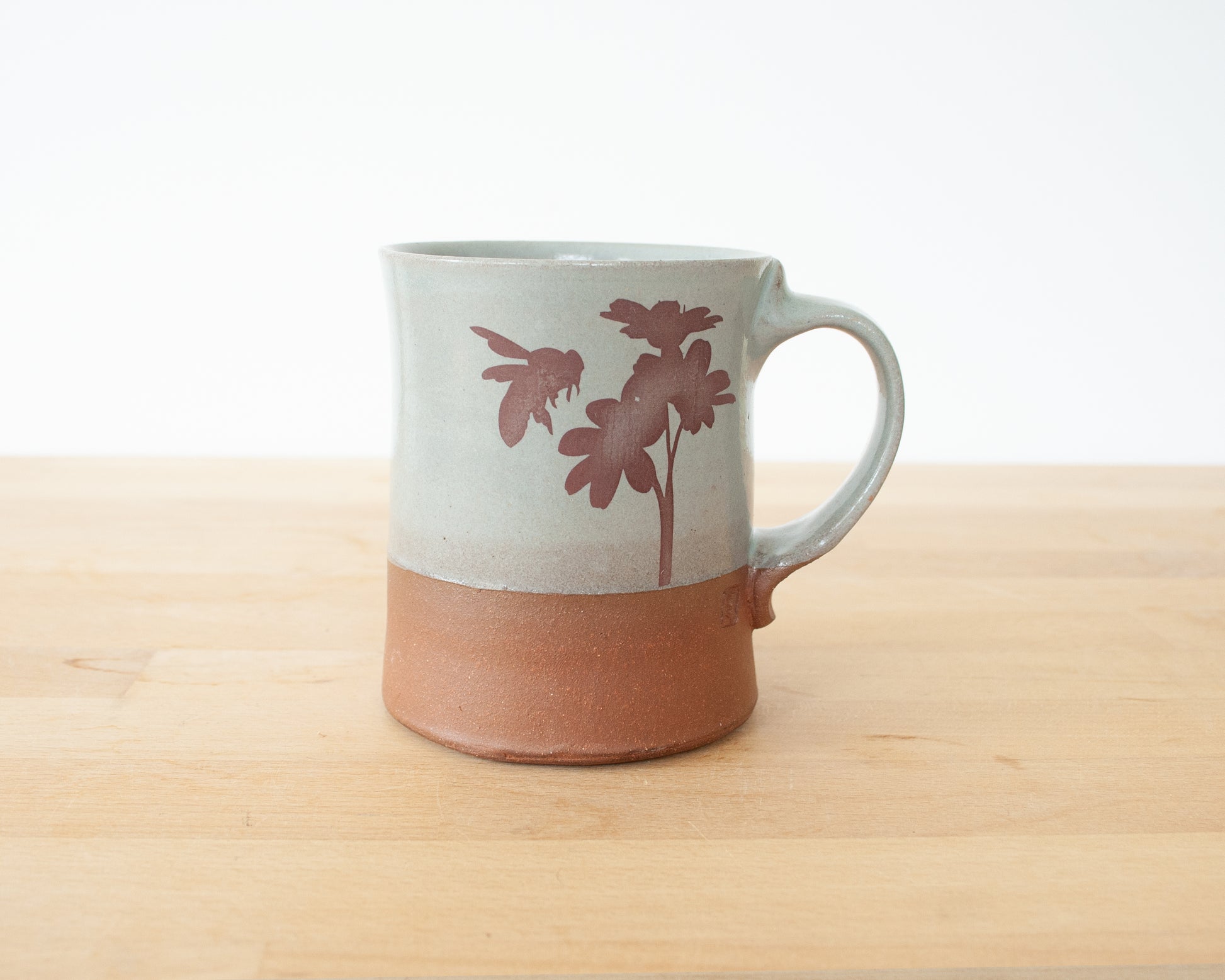 This handmade, wheel thrown mug has blue glaze and a bee and daisy design that has been fired into the glaze. The bottom section is left unglazed, and the matte raw red clay complements the smooth glazed surface of the top and interior of the mug. It also has a bee on the bottom of the mug.