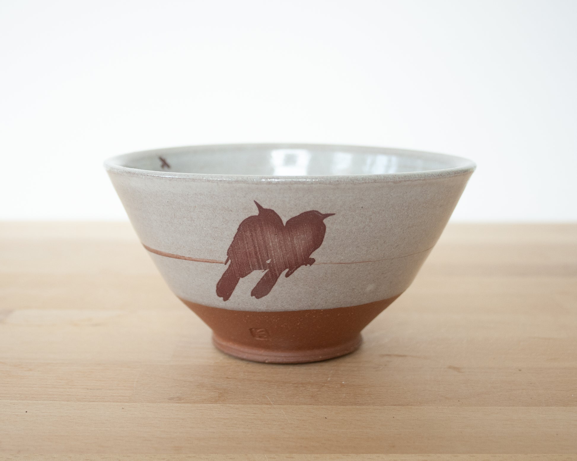 This handmade, wheel thrown bowl has white glaze and a birds on a wire design that has been fired into the glaze. The bottom section is left unglazed, and the matte raw red clay complements the smooth glazed surface of the top and interior of the bowl. It also has birds on the bottom of the bowl.