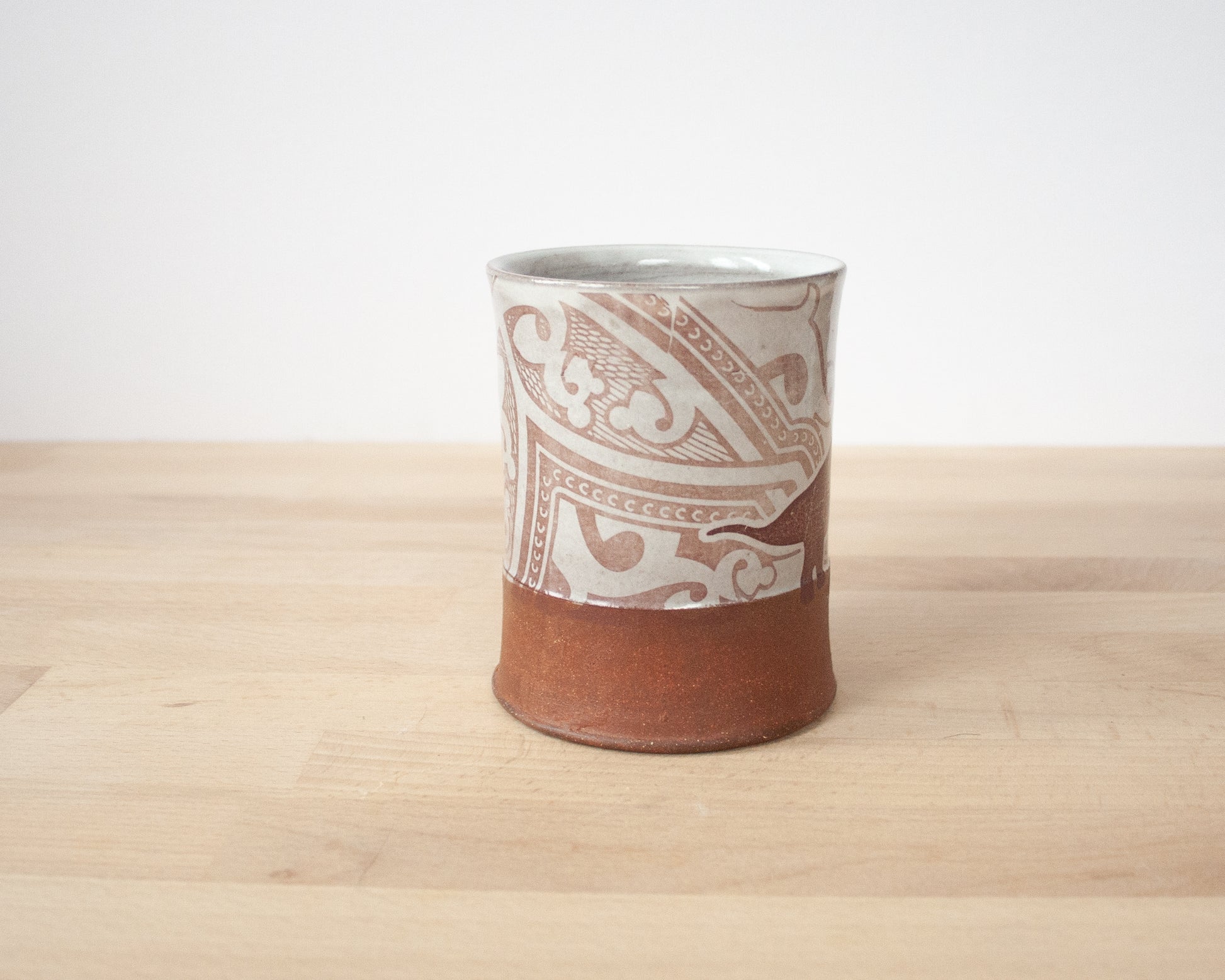 This handmade, wheel thrown mug has white glaze and a brachiosaurus and background pattern design that has been fired into the glaze. The bottom section is left unglazed, and the matte raw red clay complements the smooth glazed surface of the top and interior of the mug. It also has a brachiosaurus head on the bottom of the mug.