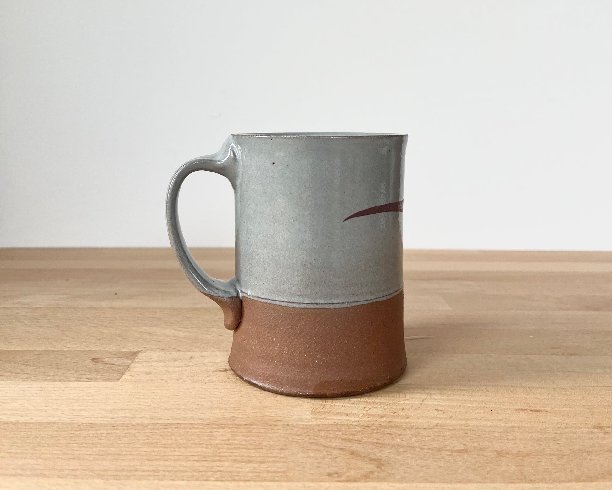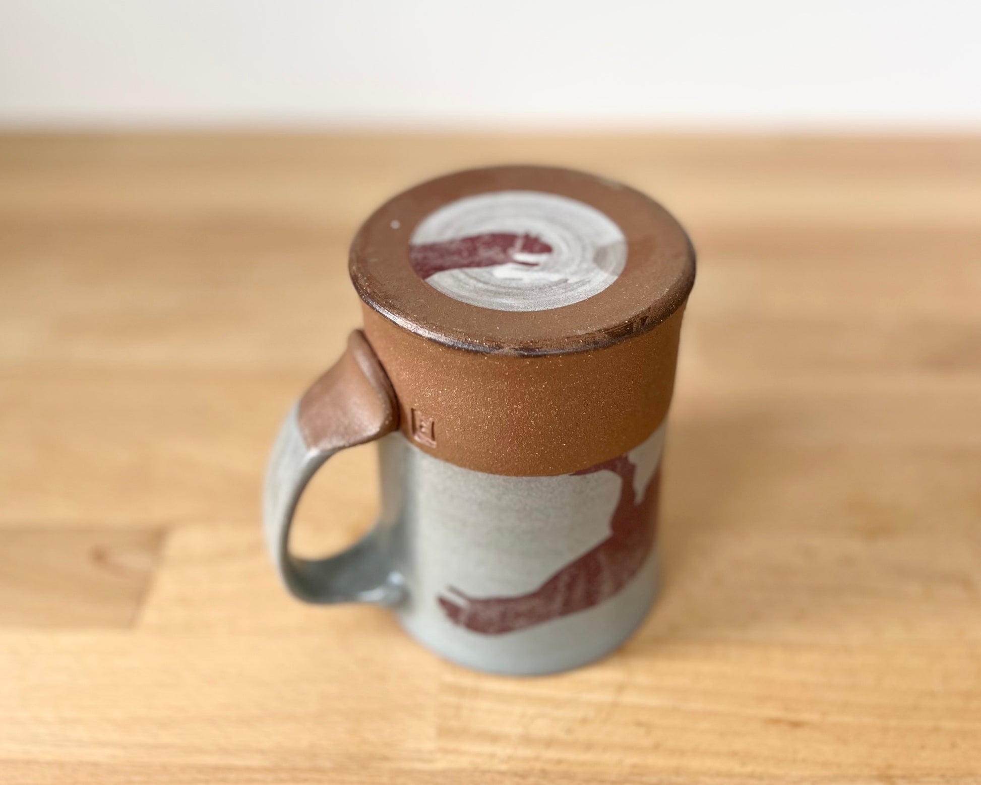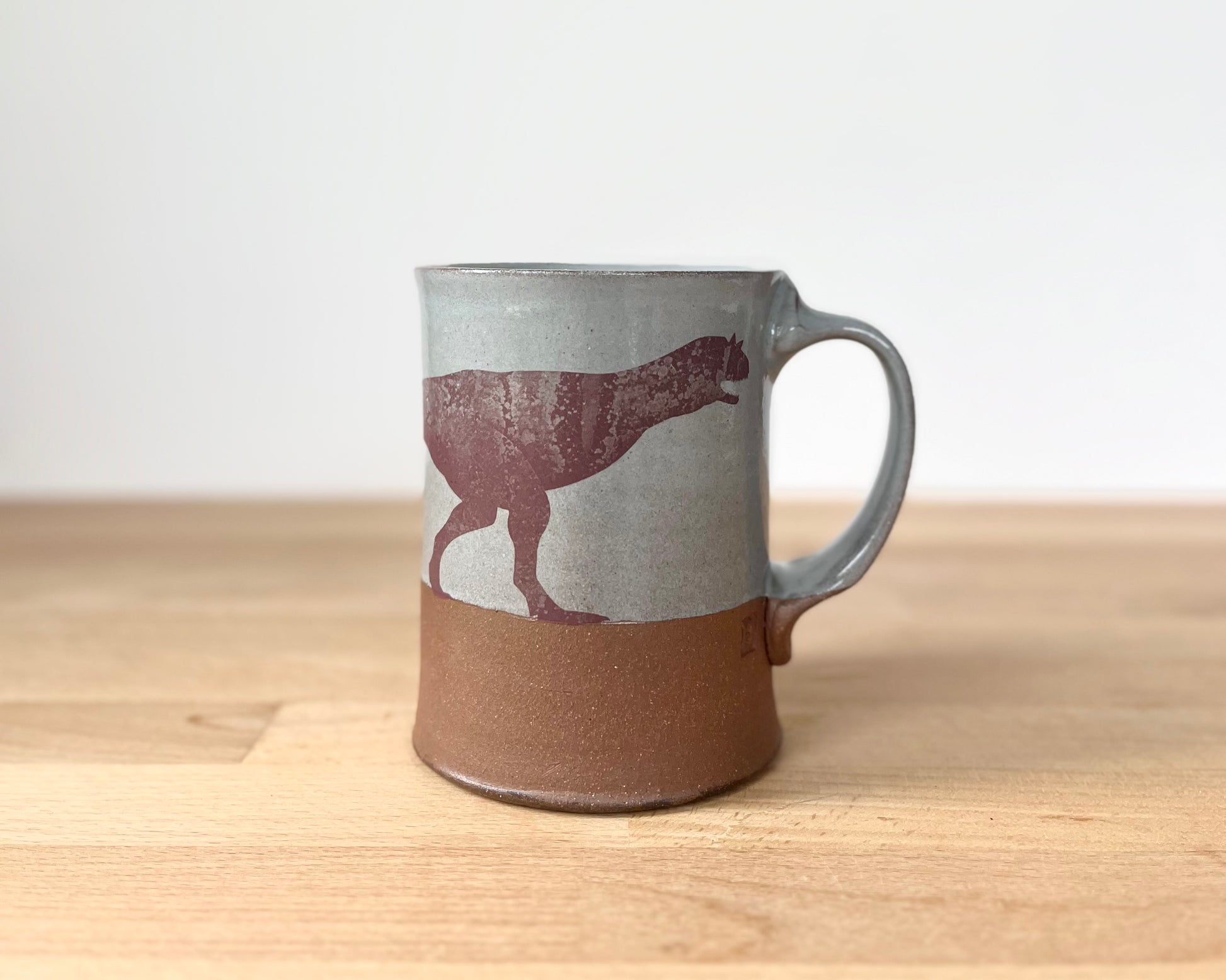 This handmade, wheel thrown mug has blue glaze and a carnotaurus design that has been fired into the glaze. The bottom section is left unglazed, and the matte raw red clay complements the smooth glazed surface of the top and interior of the mug. It also has a carnotaurus head on the bottom of the mug.