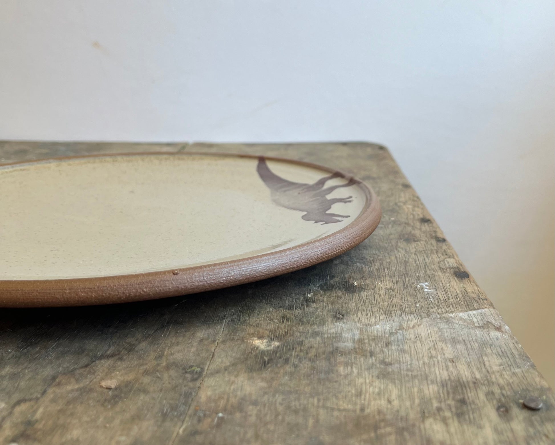 This plate is approximately 1.25"x10.5" and was fired to over 2100F. It is food, microwave and dishwasher safe.