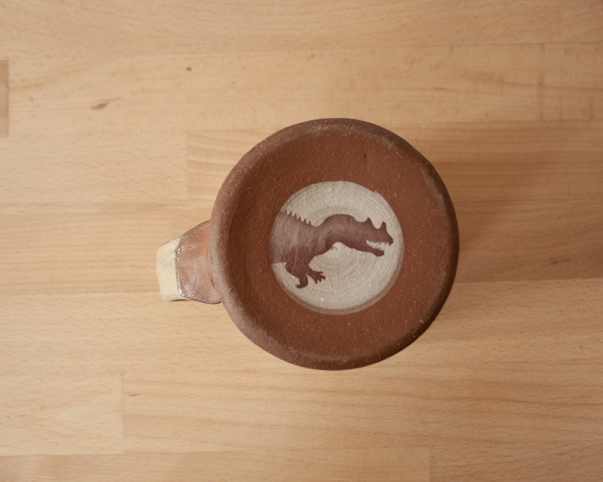 This handmade, wheel thrown mug has speckled yellow glaze and a ceratosaurus design that has been fired into the glaze. The bottom section is left unglazed, and the matte raw red clay complements the smooth glazed surface of the top and interior of the mug. It also has a ceratosaurus head on the bottom of the mug.
