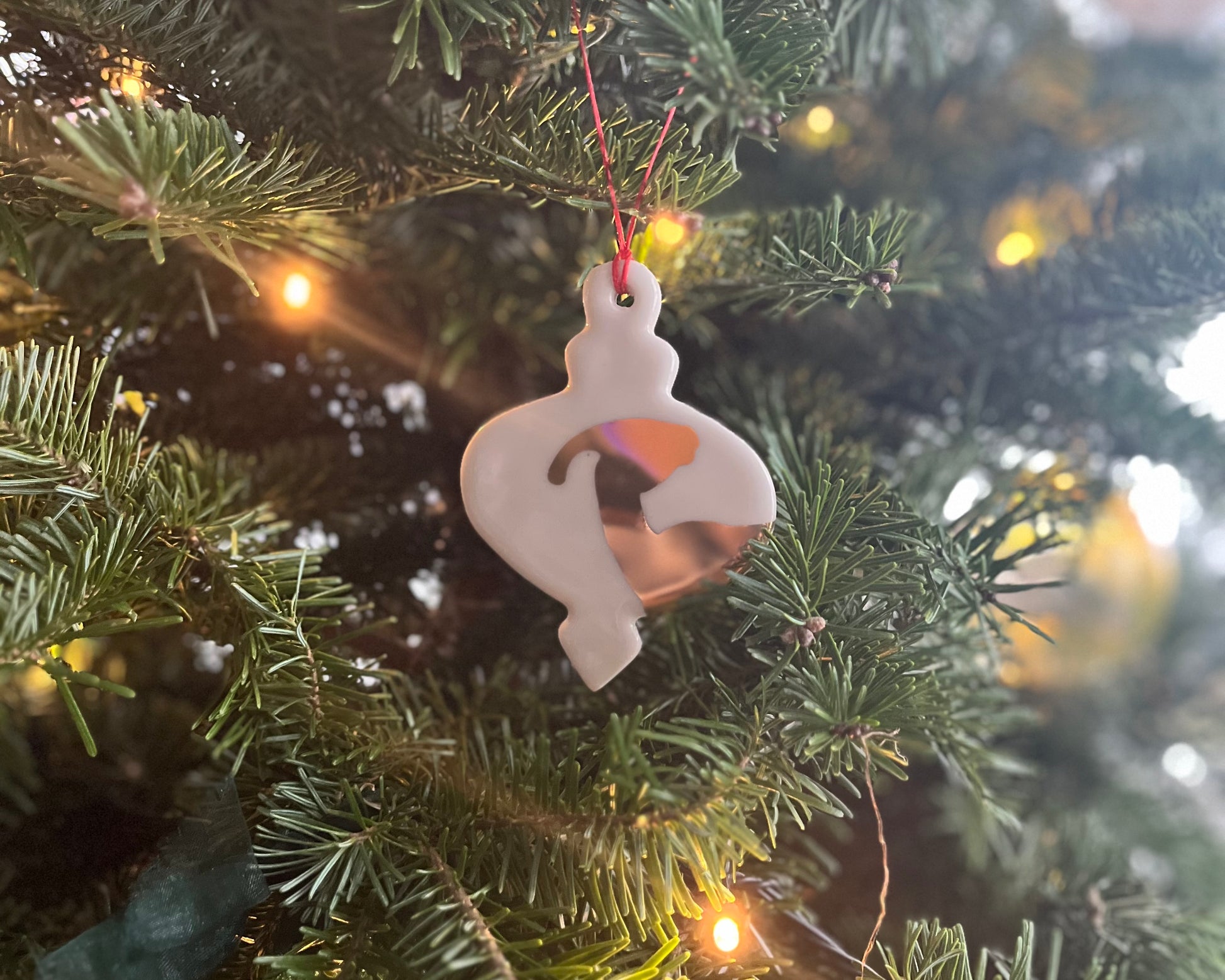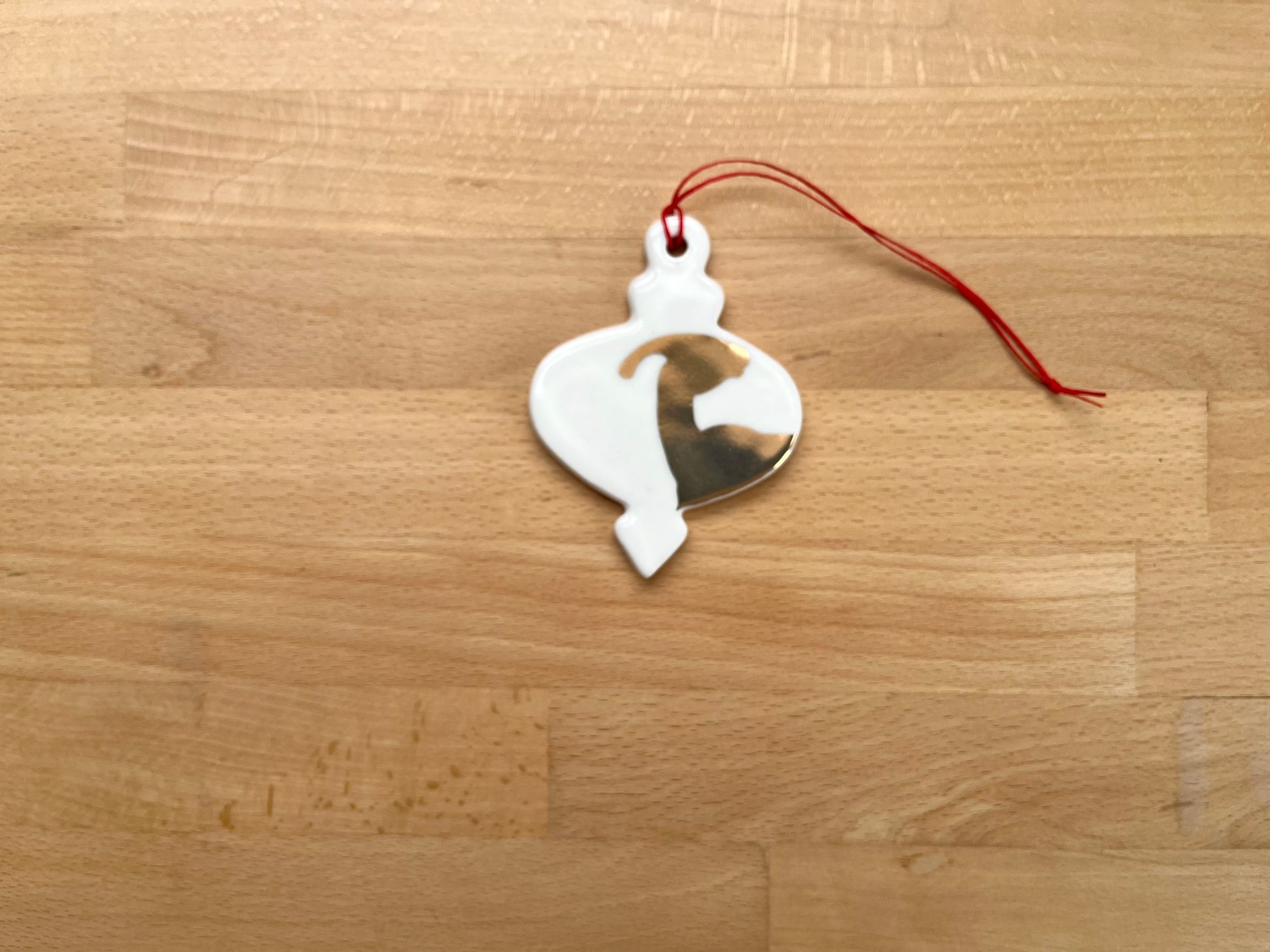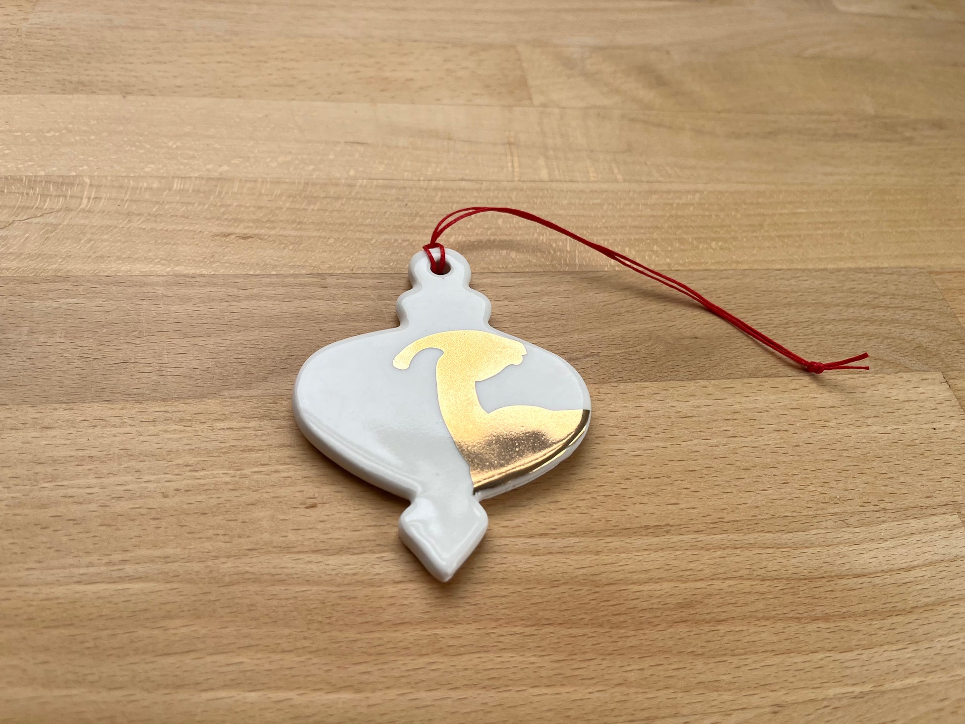 This porcelain ornament is decorated with a 22k gold parasaurolophus and has a natural red waxed cotton thread. It is 2.75” wide by 3.75” tall. It has been fired to over 2200 degrees.