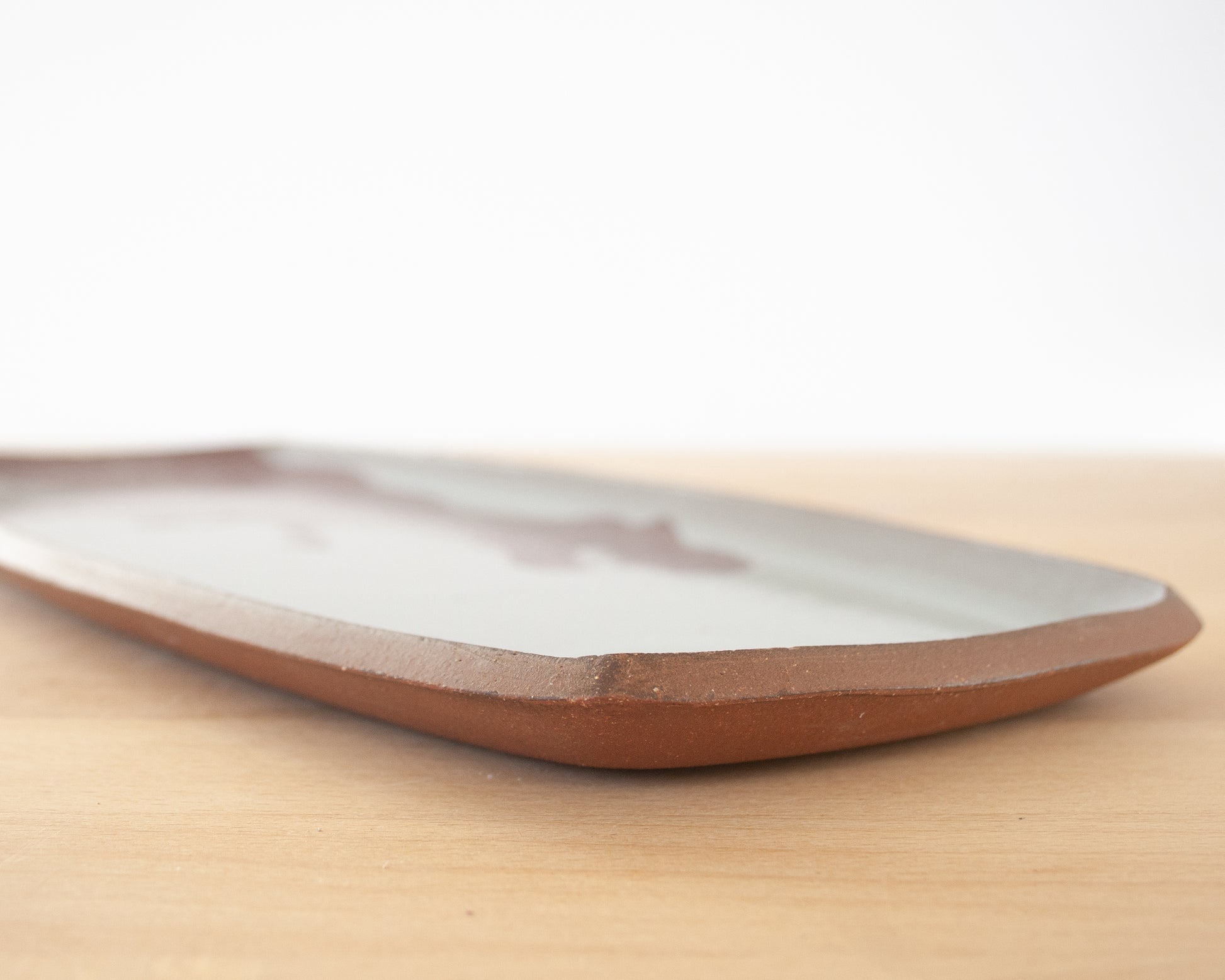 This plate is approximately 12"x5.75"x0.5" and was fired to over 2100F. It is food, microwave and dishwasher safe.