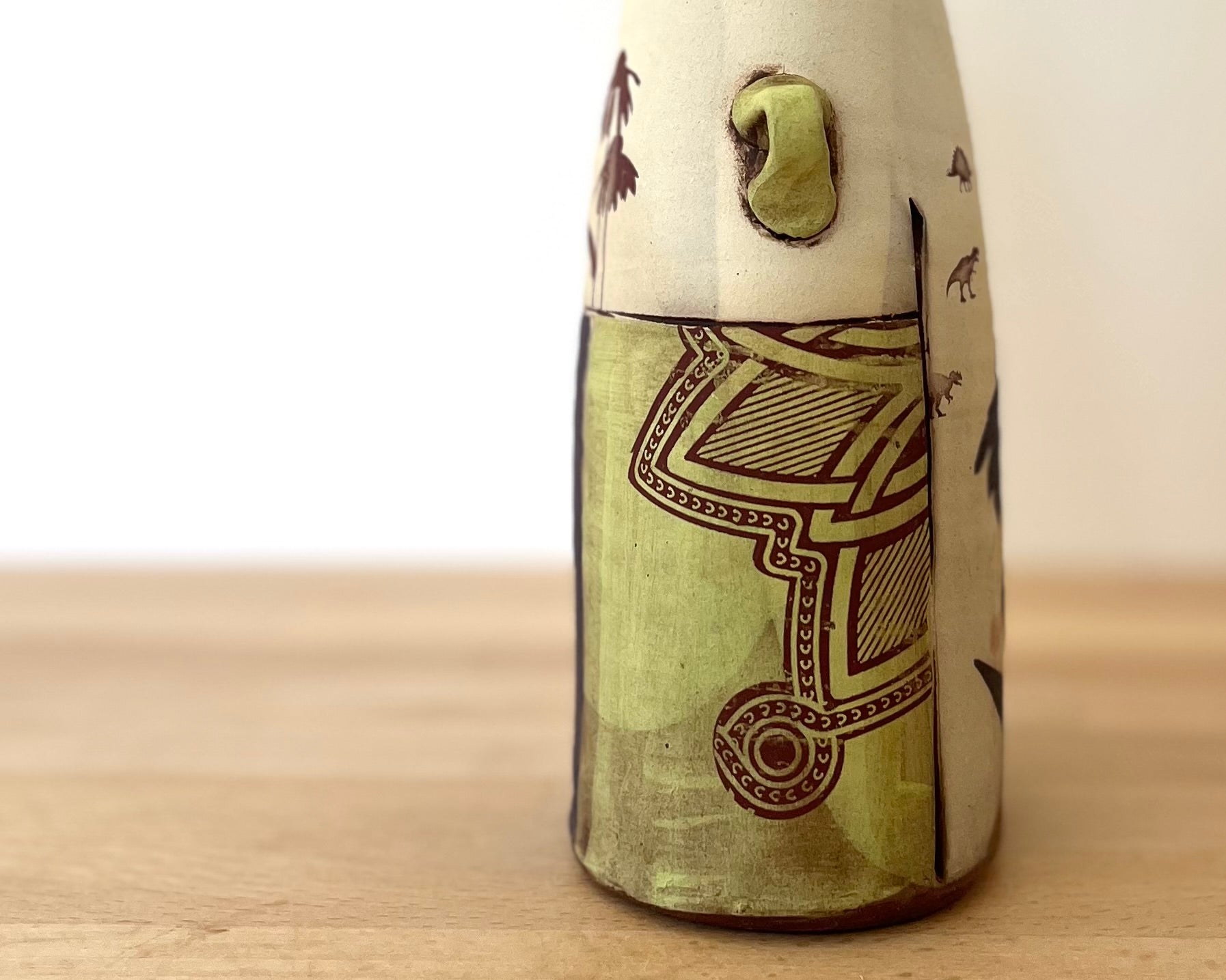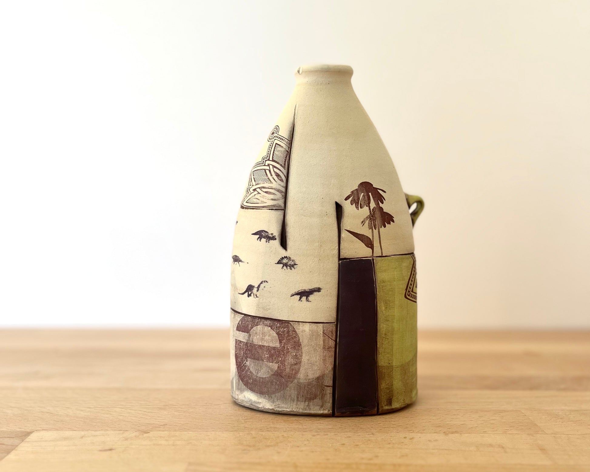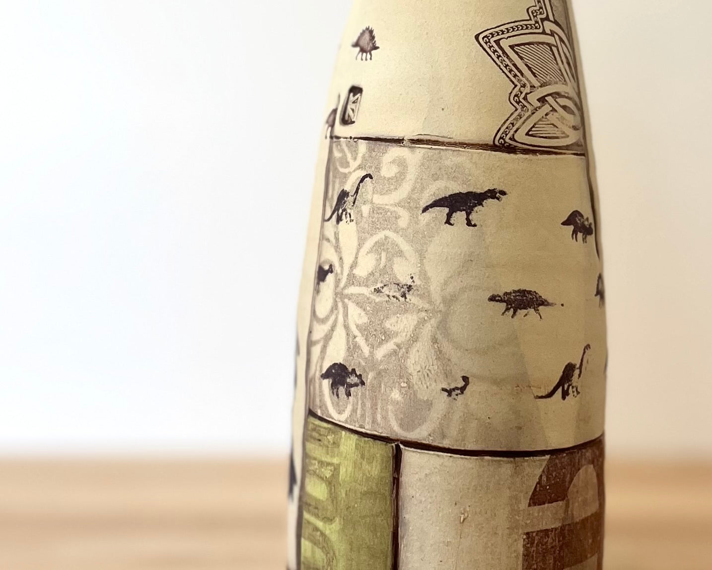 This handmade vase has terra sigillata, underglaze, glaze, and iron decals that have been fired onto the glaze.