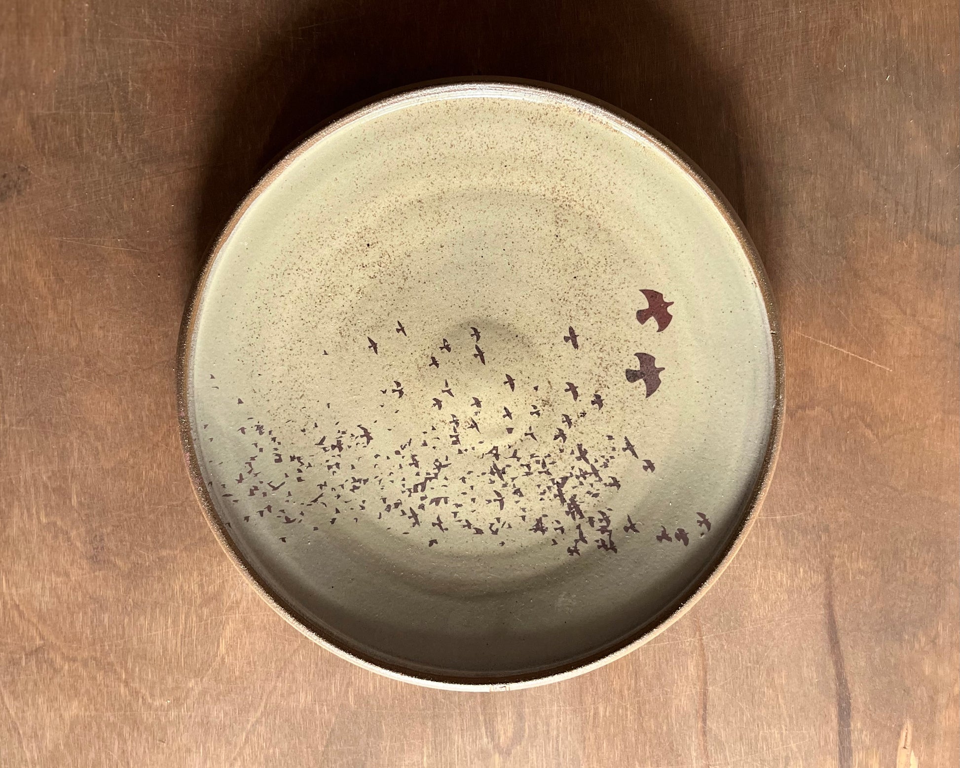 This handmade, wheel thrown plate has yellow glaze and a flock of birds design that has been fired into the glaze.