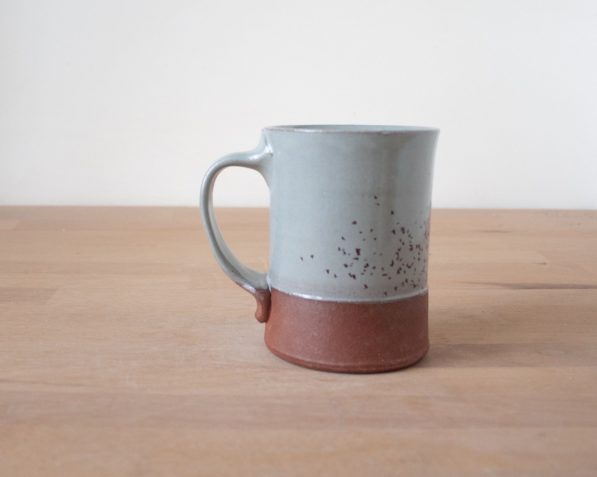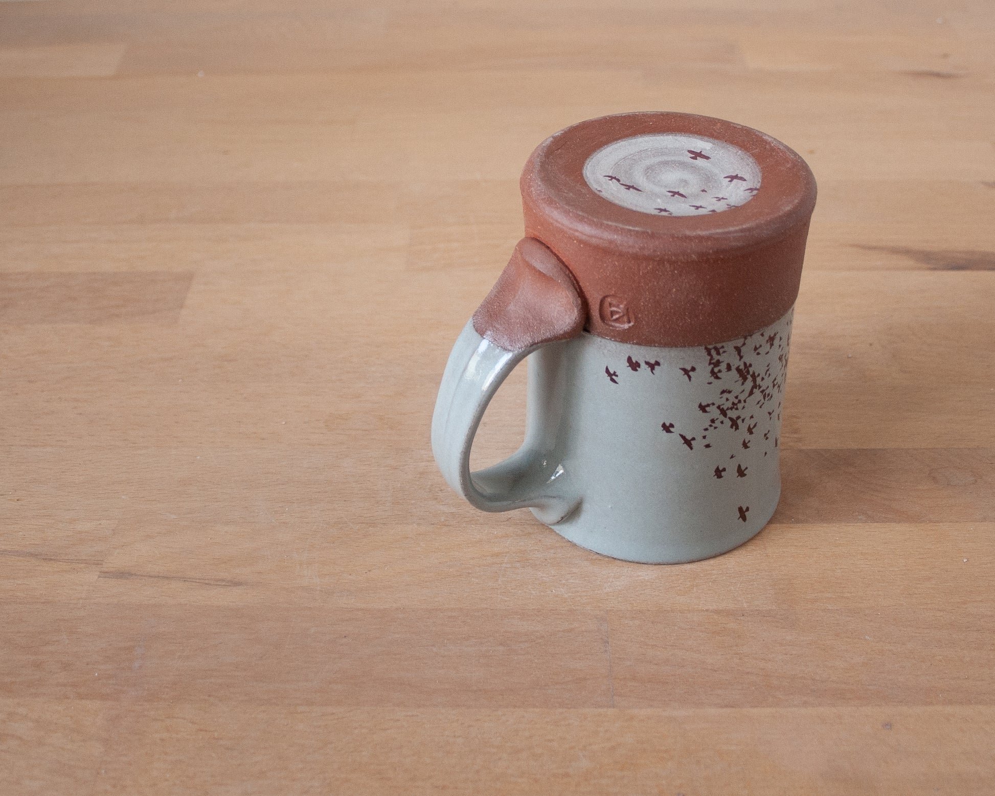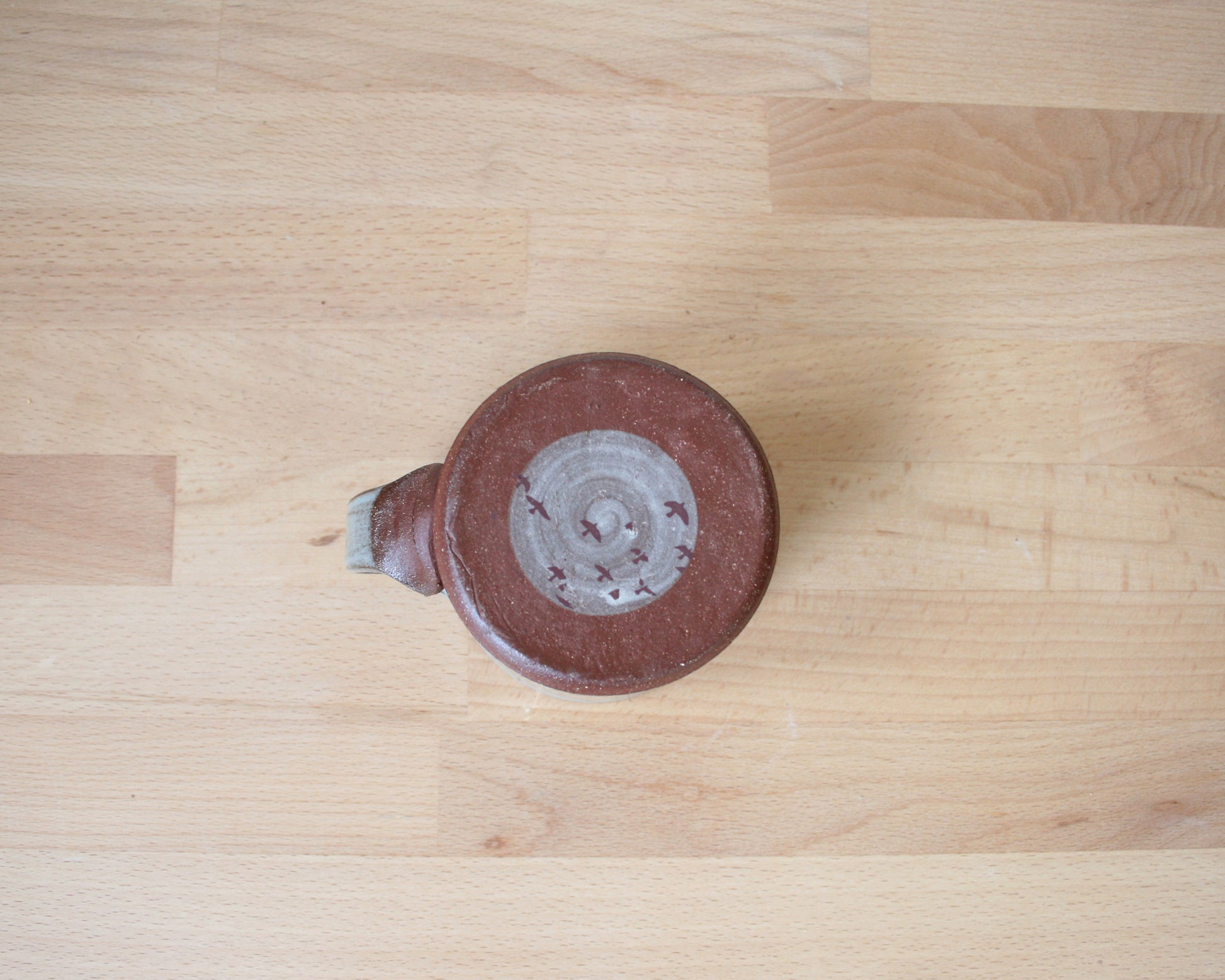 This handmade, wheel thrown mug has blue glaze and a flock of birds design that has been fired into the glaze. The bottom section is left unglazed, and the matte raw red clay complements the smooth glazed surface of the top and interior of the mug. It also has birds on the bottom of the mug.