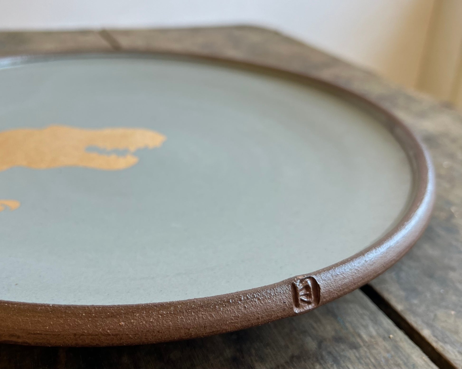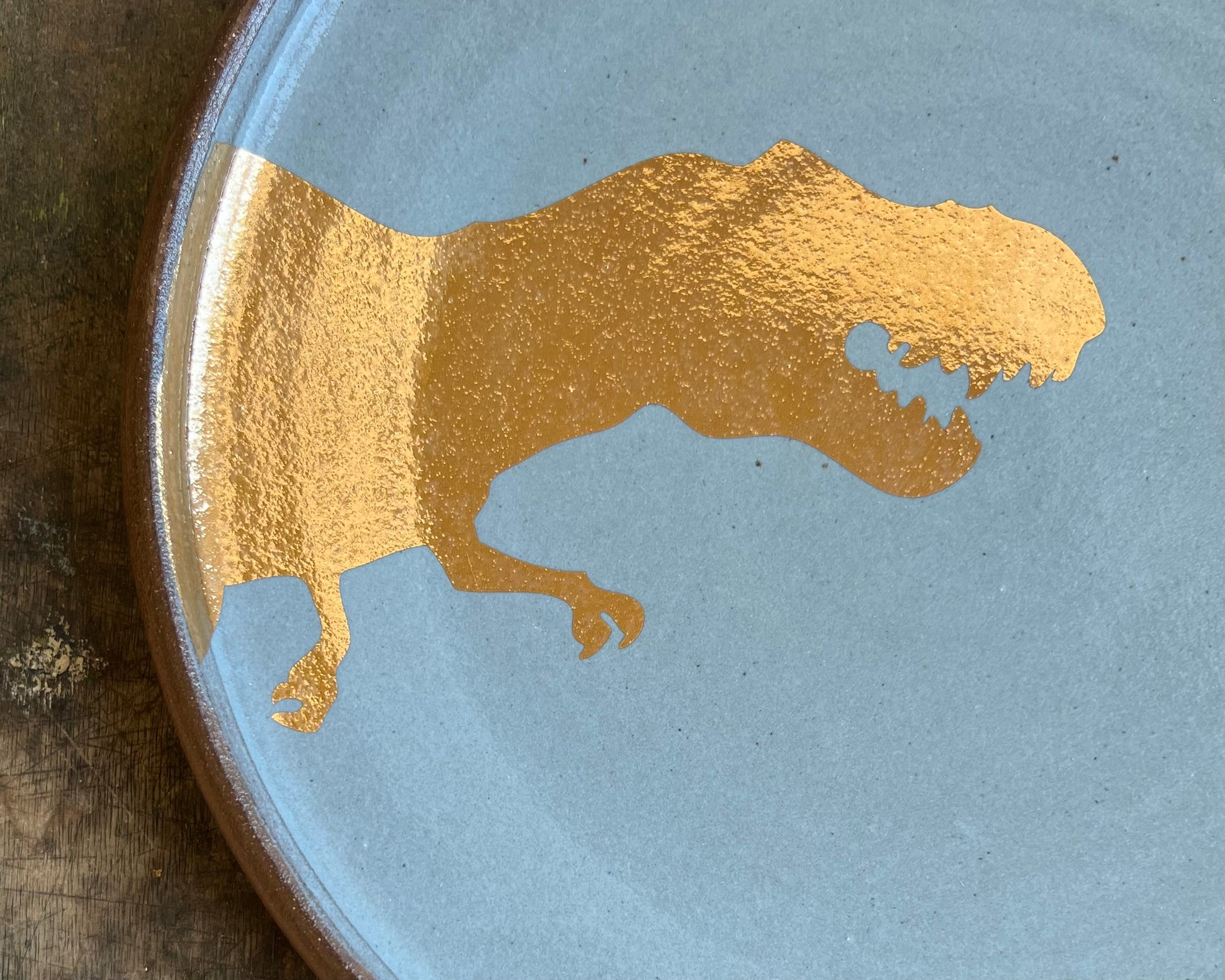 This handmade, wheel thrown plate has blue glaze and a 22k gold T-Rex design that has been fired into the glaze.