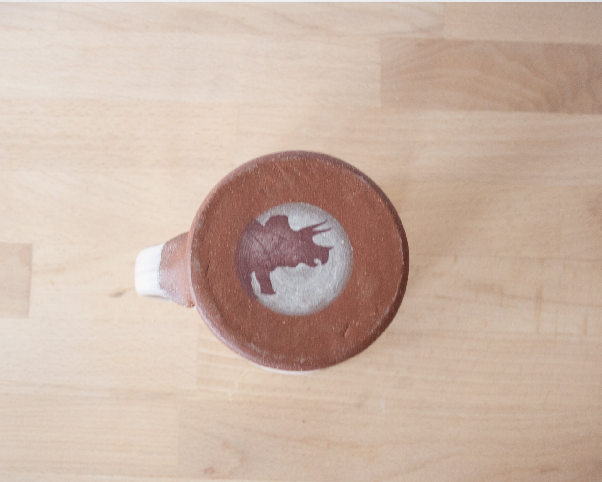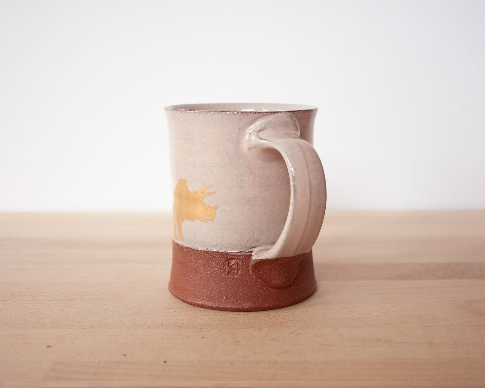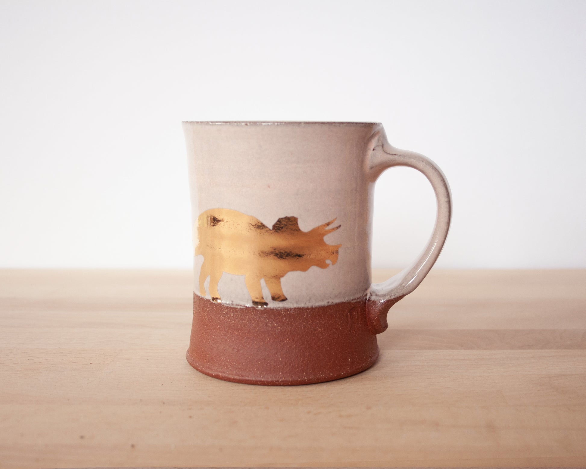This handmade, wheel thrown mug has pale pink glaze and a 22k gold triceratops design that has been fired into the glaze. The bottom section is left unglazed, and the matte raw red clay complements the smooth glazed surface of the top and interior of the mug. It also has a triceratops on the bottom of the mug.