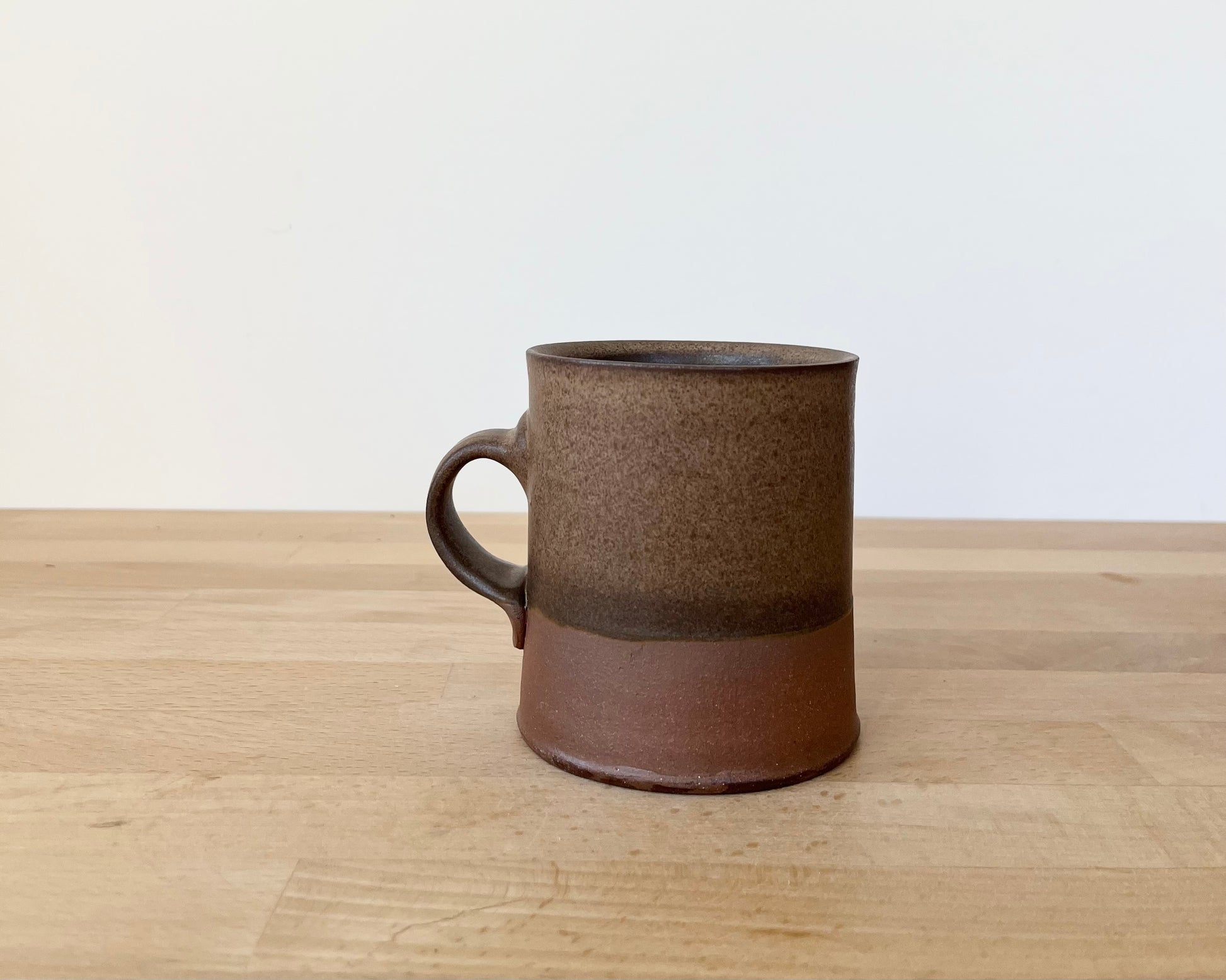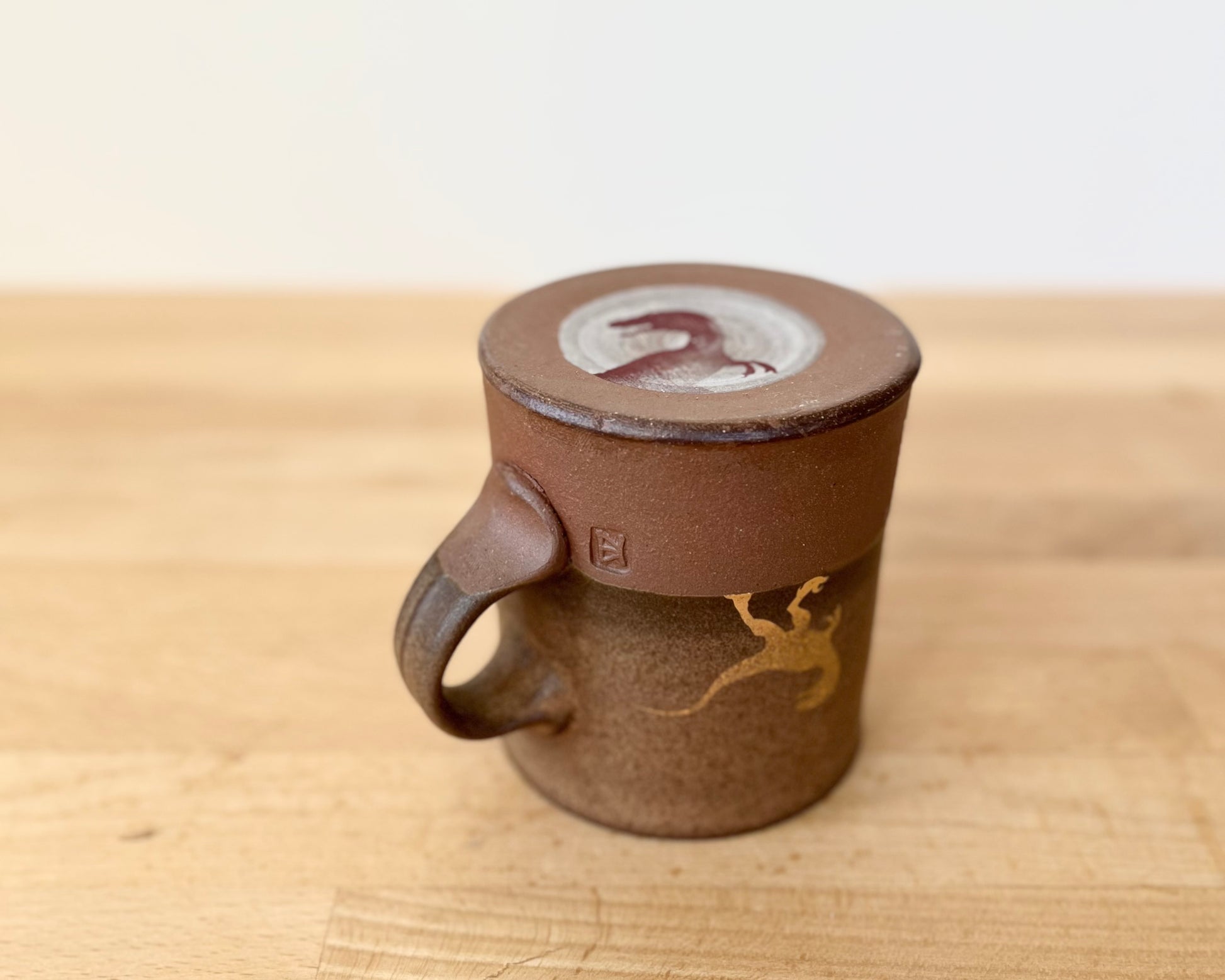 This handmade, wheel thrown mug has brown matte glaze and a 22k gold velociraptor design that has been fired into the glaze. The bottom section is left unglazed, and the matte raw red clay complements the smooth glazed surface of the top and interior of the mug. It also has a velociraptor head on the bottom of the mug.