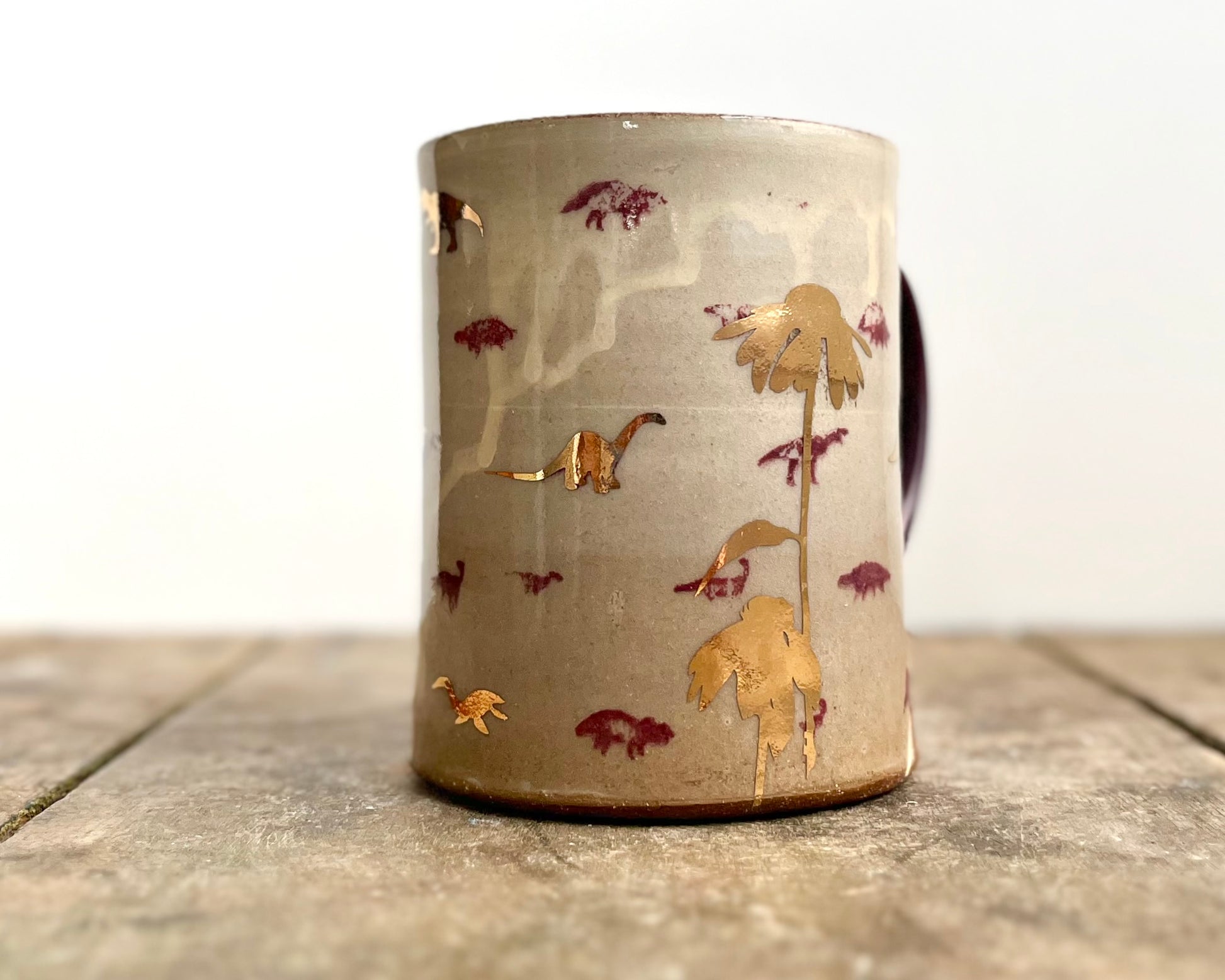 This handmade, wheel thrown mug has terra sigillata and clear glaze, and is decorated with silkscreen and iron and 22k gold decals.