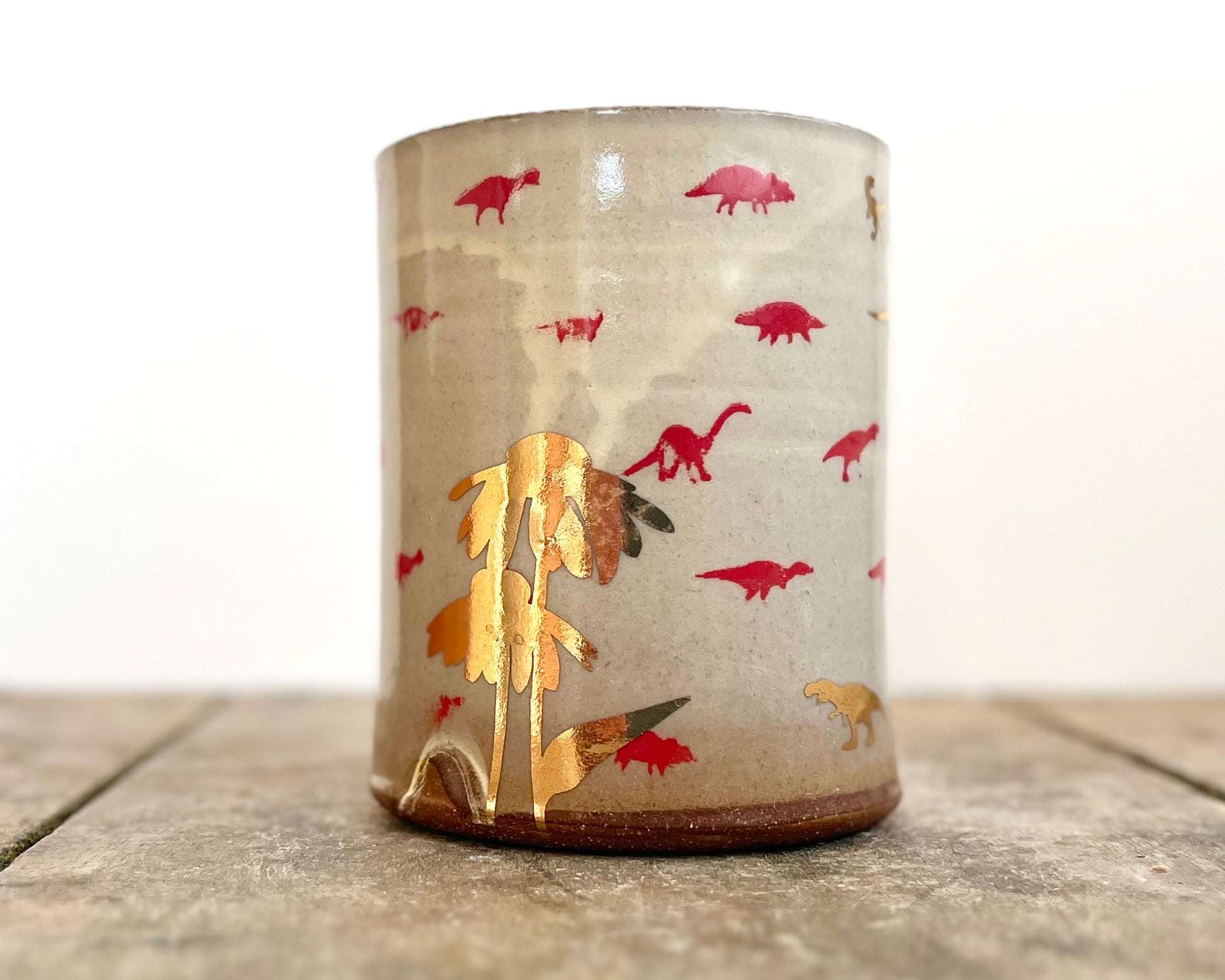 This handmade, wheel thrown mug has terra sigillata and clear glaze, and is decorated with silkscreen, iron decals, and 22k gold decals.