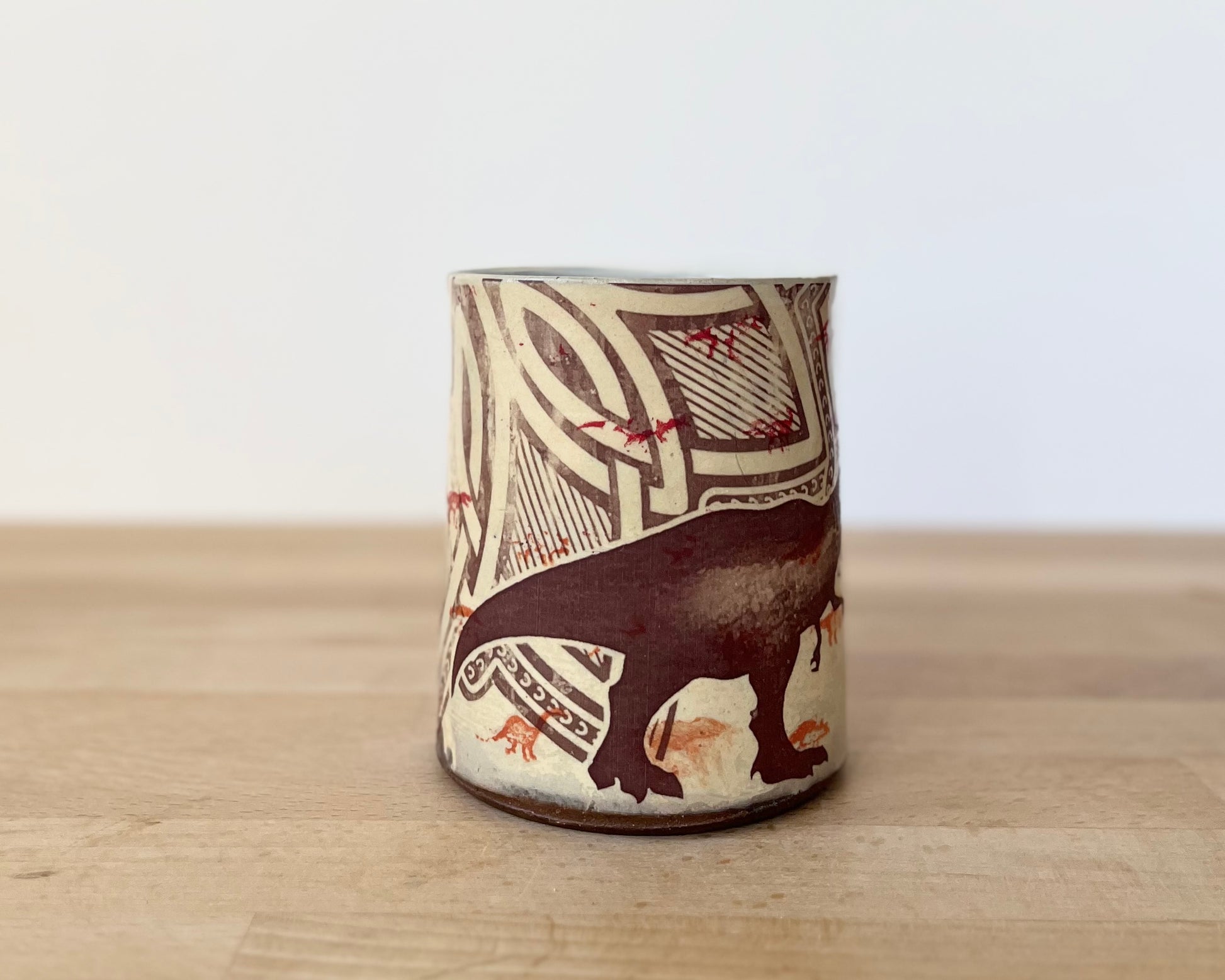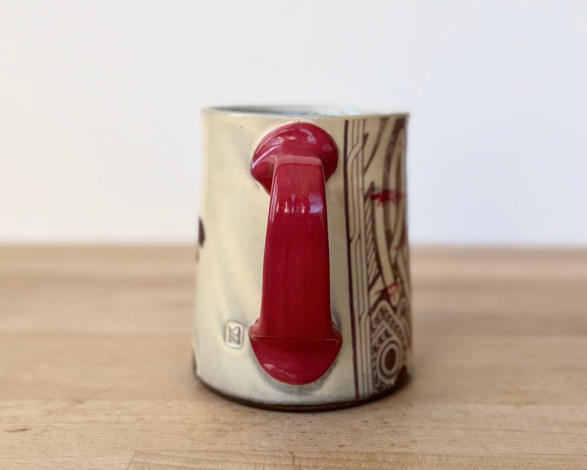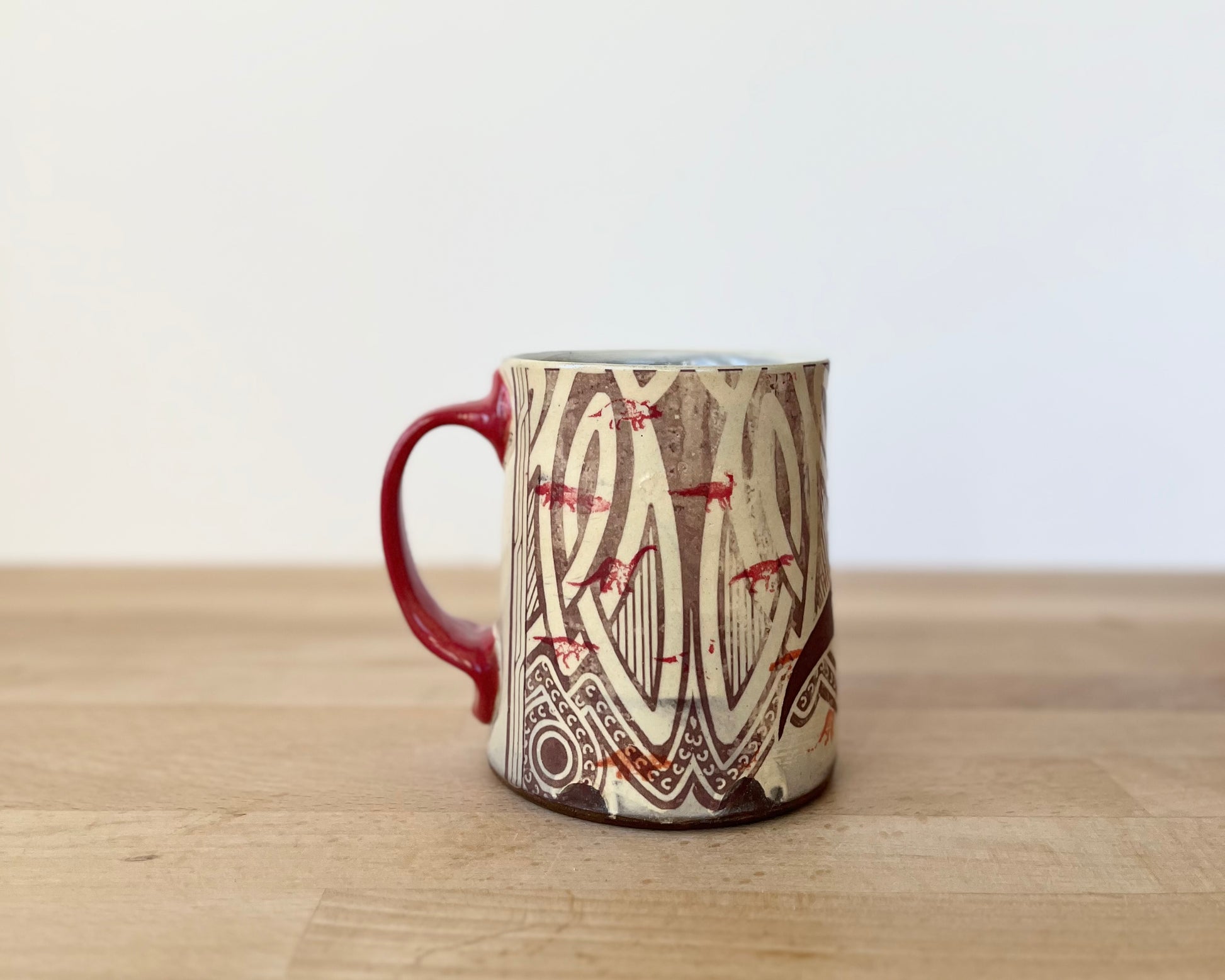 This handmade, wheel thrown mug has terra sigillata, clear glaze and a pattern of red silkscreened dinosaurs and a T-Rex with background pattern.