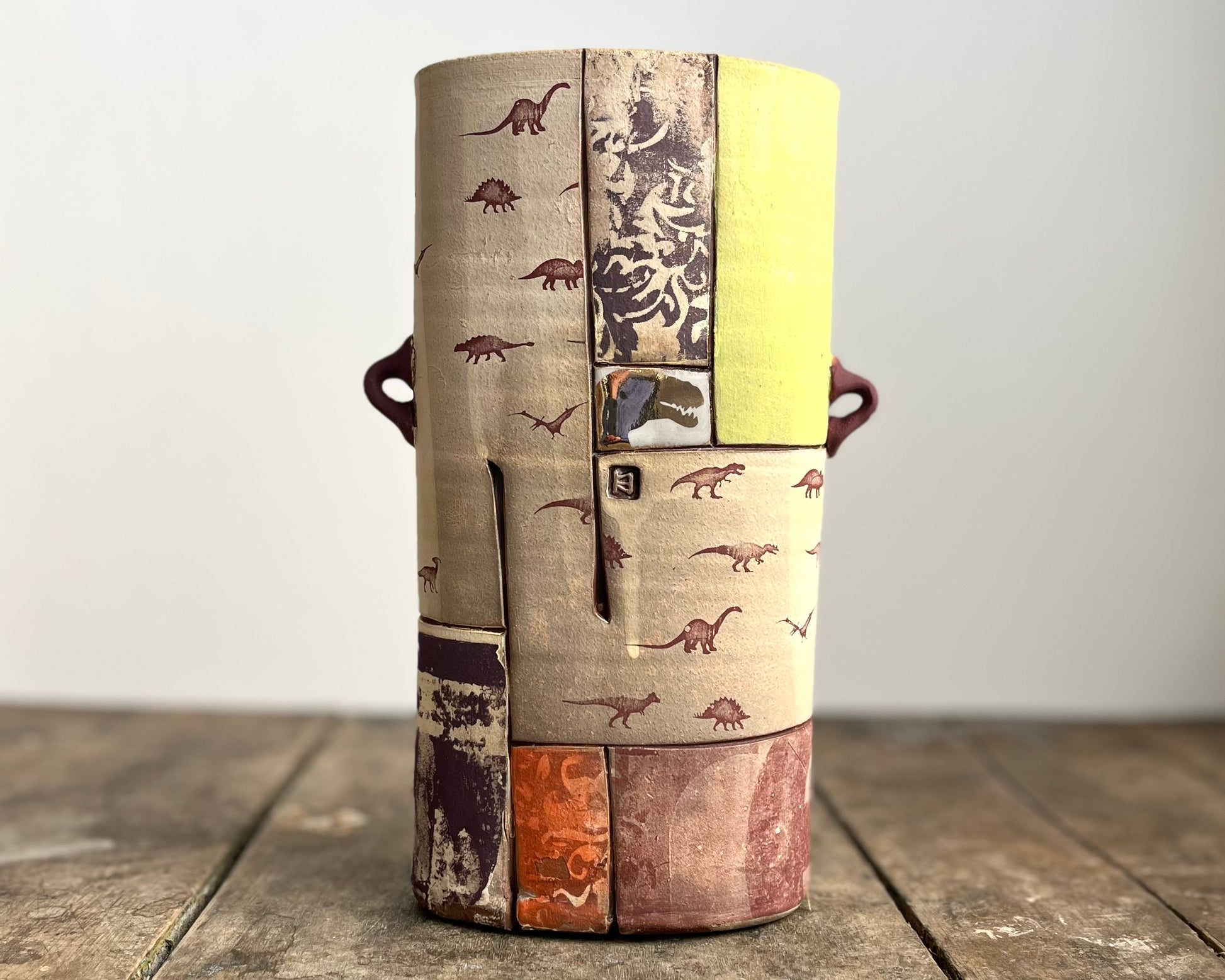 This handmade vase has terra sigillata, underglaze, glaze, gold luster and iron decals that have been fired onto the glaze.