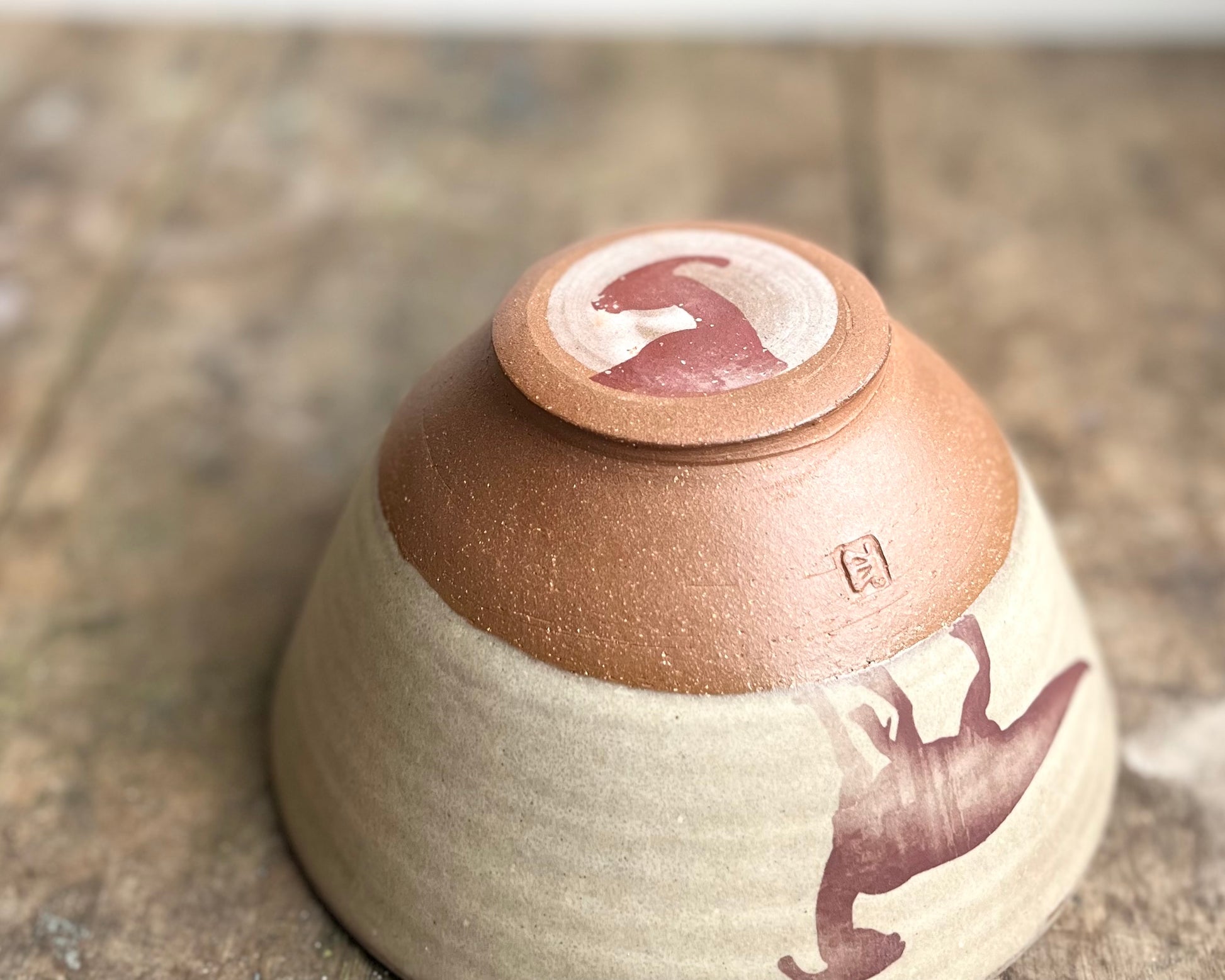 This handmade, wheel thrown bowl has matte glaze and a parasaurolophus design that has been fired into the glaze. The bottom section is left unglazed, and the matte raw red clay complements the smooth glazed surface of the top and interior of the bowl. It also has a parasaurolophus head on the bottom of the bowl.