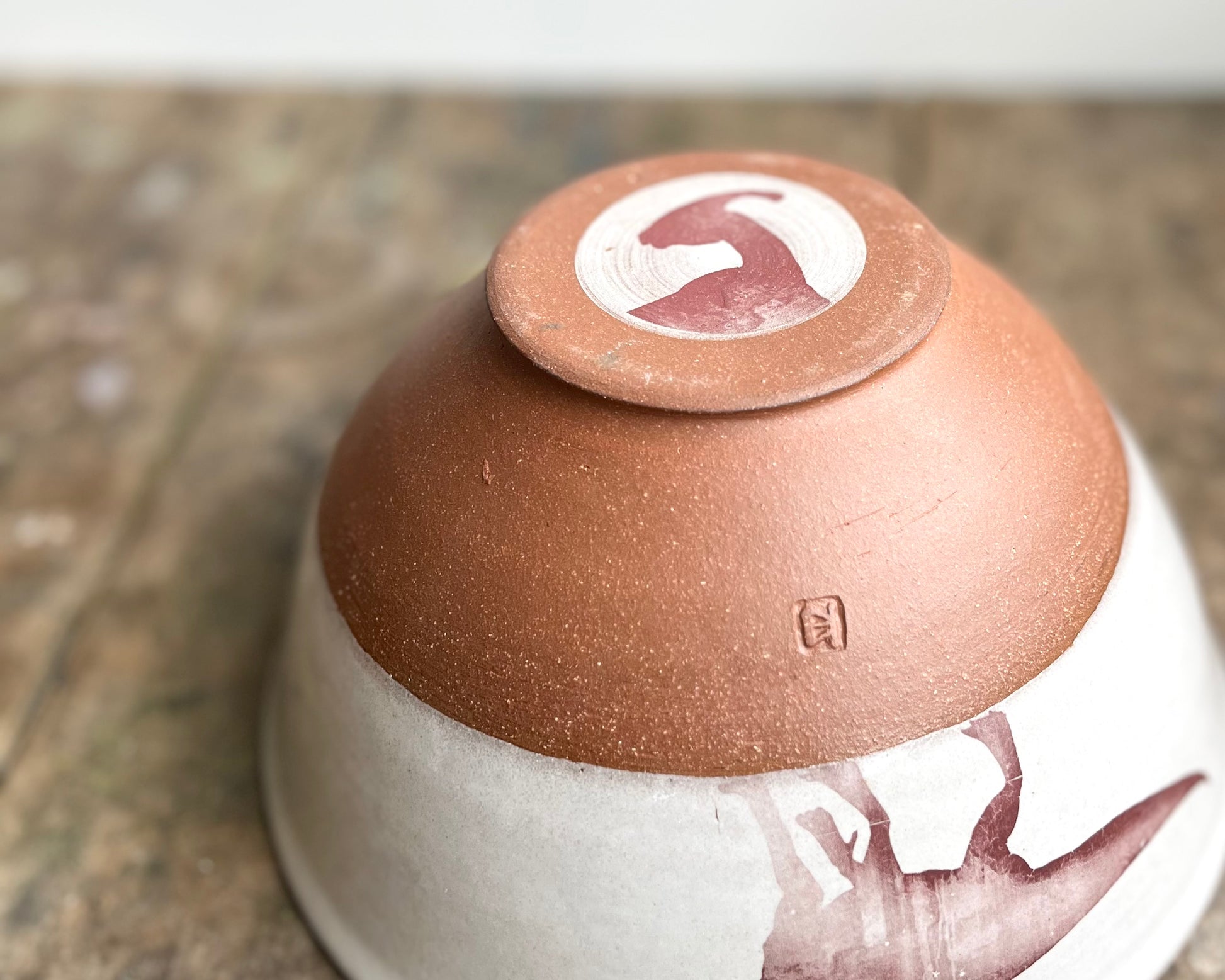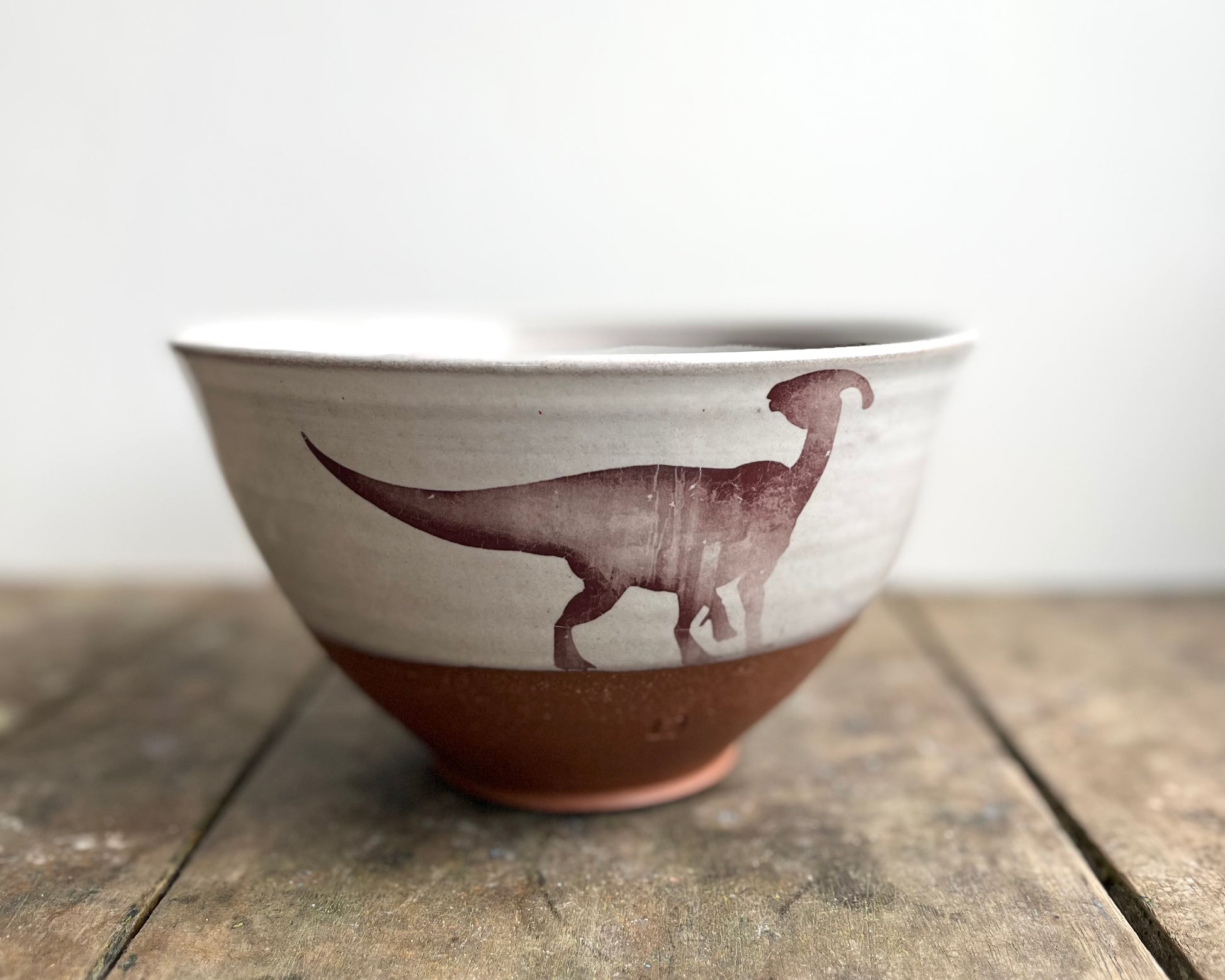 This handmade, wheel thrown bowl has white glaze and a parasaurolophus design that has been fired into the glaze. The bottom section is left unglazed, and the matte raw red clay complements the smooth glazed surface of the top and interior of the bowl. It also has a parasaurolophus head on the bottom of the bowl.