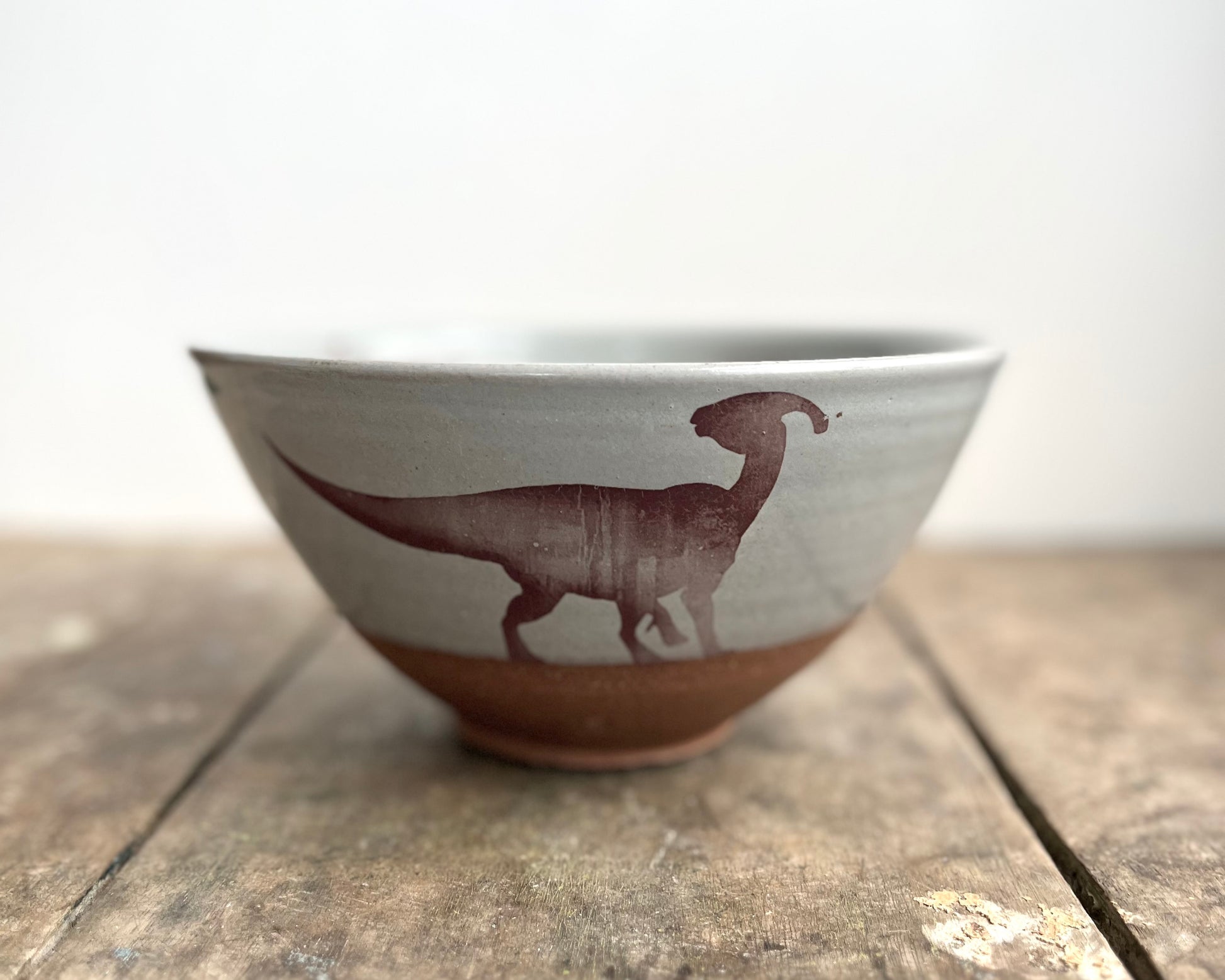 This handmade, wheel thrown bowl has blue glaze and a parasaurolophus design that has been fired into the glaze. The bottom section is left unglazed, and the matte raw red clay complements the smooth glazed surface of the top and interior of the bowl. It also has a parasaurolophus head on the bottom of the bowl.