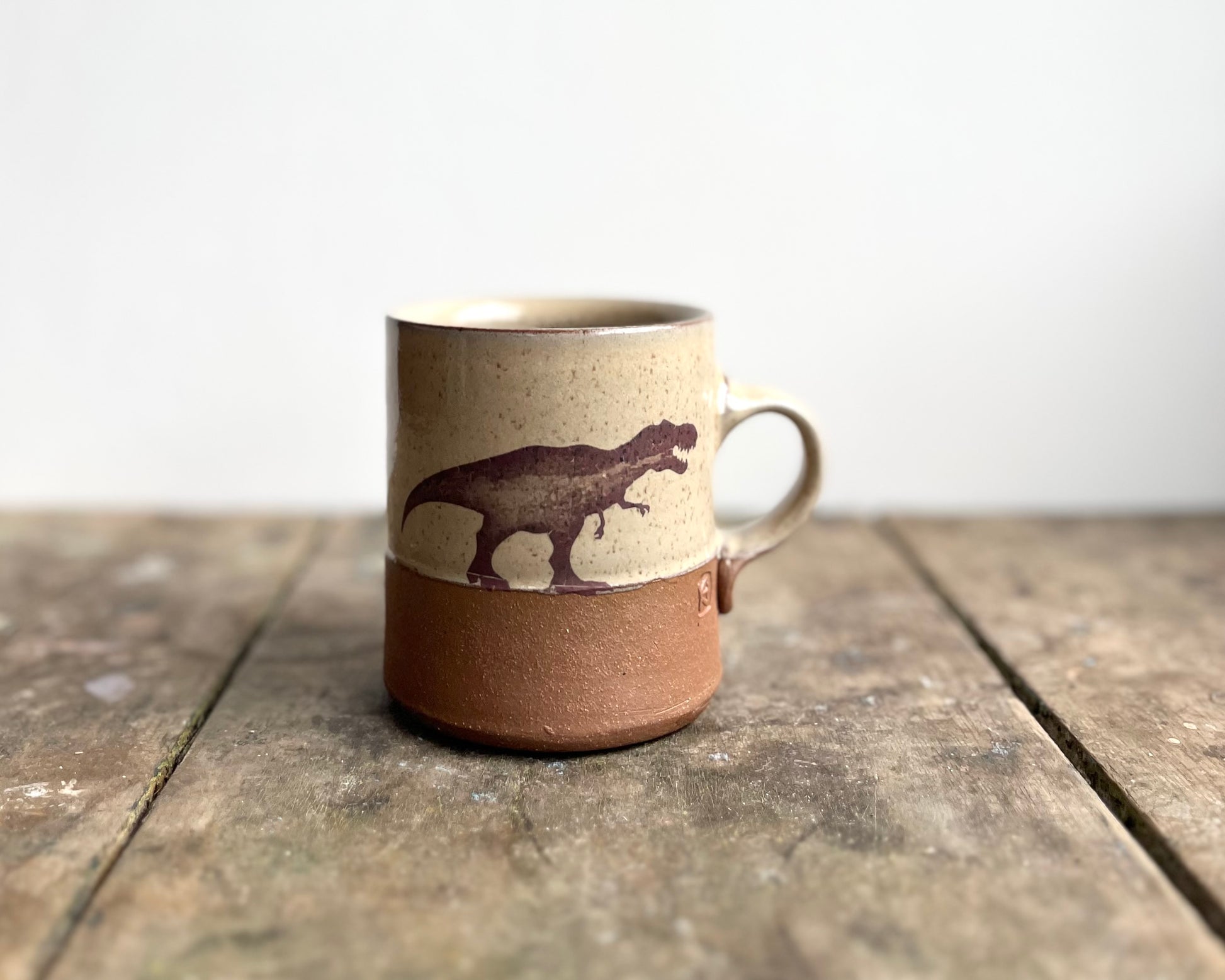 This handmade, wheel thrown mug has a T-Rex design that has been fired into the glaze. The bottom section is left unglazed, and the matte raw red clay complements the smooth glazed surface of the top and interior of the mug. It also has a T-Rex head on the bottom of the mug.