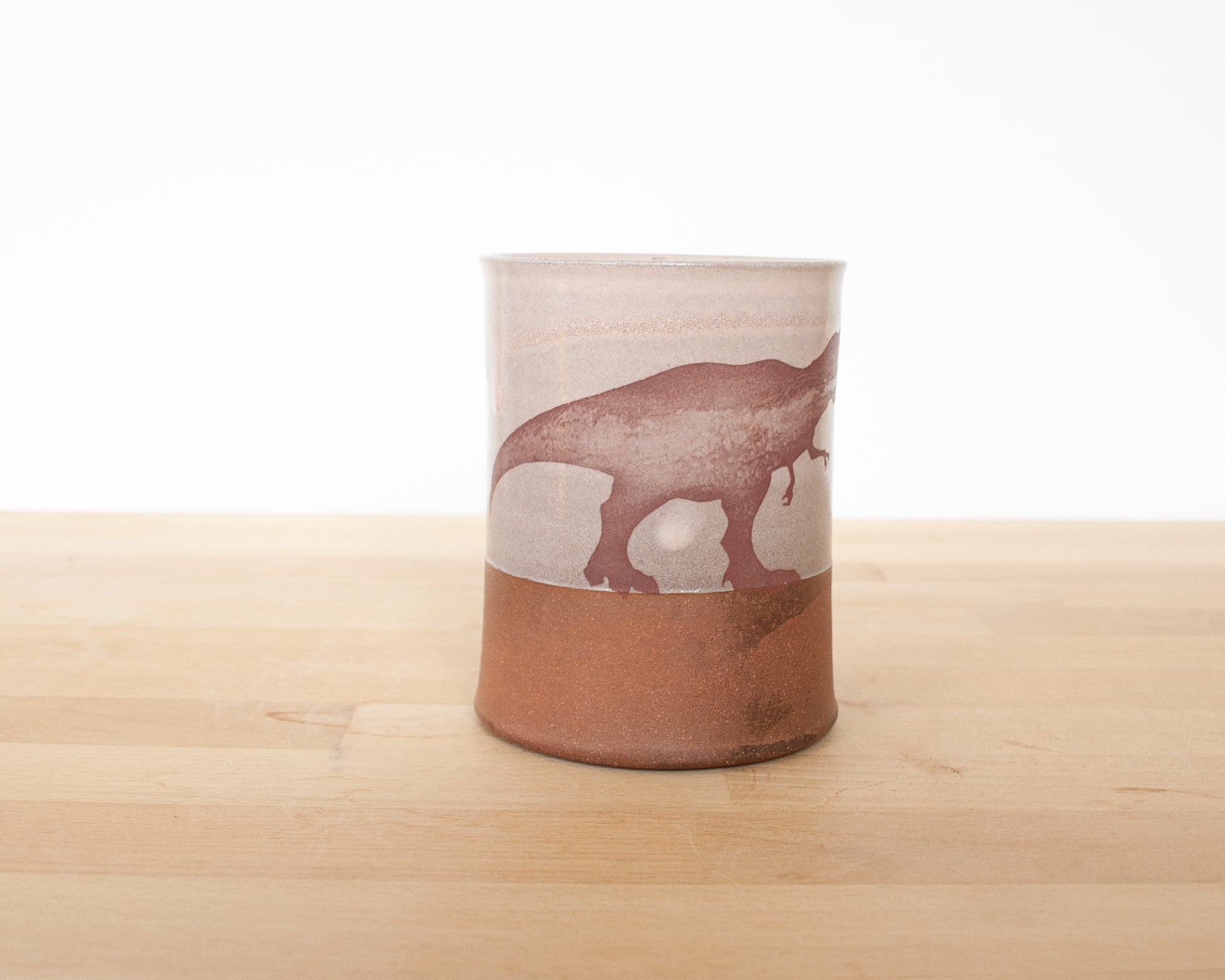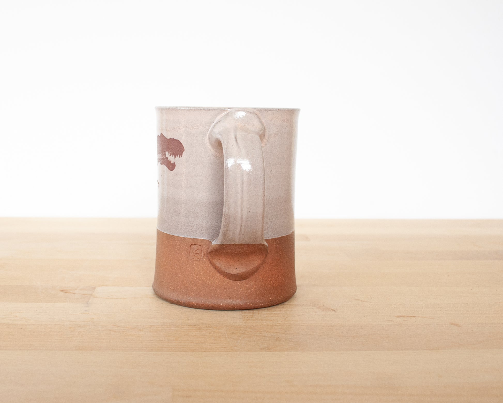 This handmade, wheel thrown mug has pale pink glaze and a T-Rex design that has been fired into the glaze. The bottom section is left unglazed, and the matte raw red clay complements the smooth glazed surface of the top and interior of the mug. It also has a T-Rex head on the bottom of the mug.