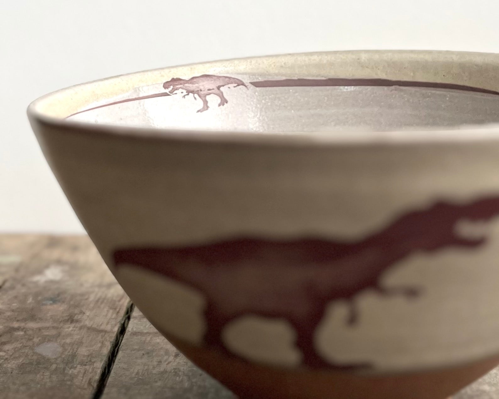 This handmade, wheel thrown bowl has glaze and a T-Rex design that has been fired into the glaze. The bottom section is left unglazed, and the matte raw red clay complements the smooth glazed surface of the top and interior of the bowl. It also has a T-Rex head on the bottom of the bowl.
