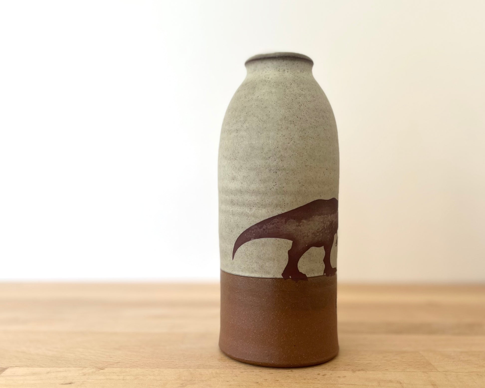 This handmade, wheel thrown vase has blue glaze and a triceratops design that has been fired onto the glaze. The bottom section is left unglazed, and the matte raw red clay complements the smooth glazed surface of the top and interior of the vase.