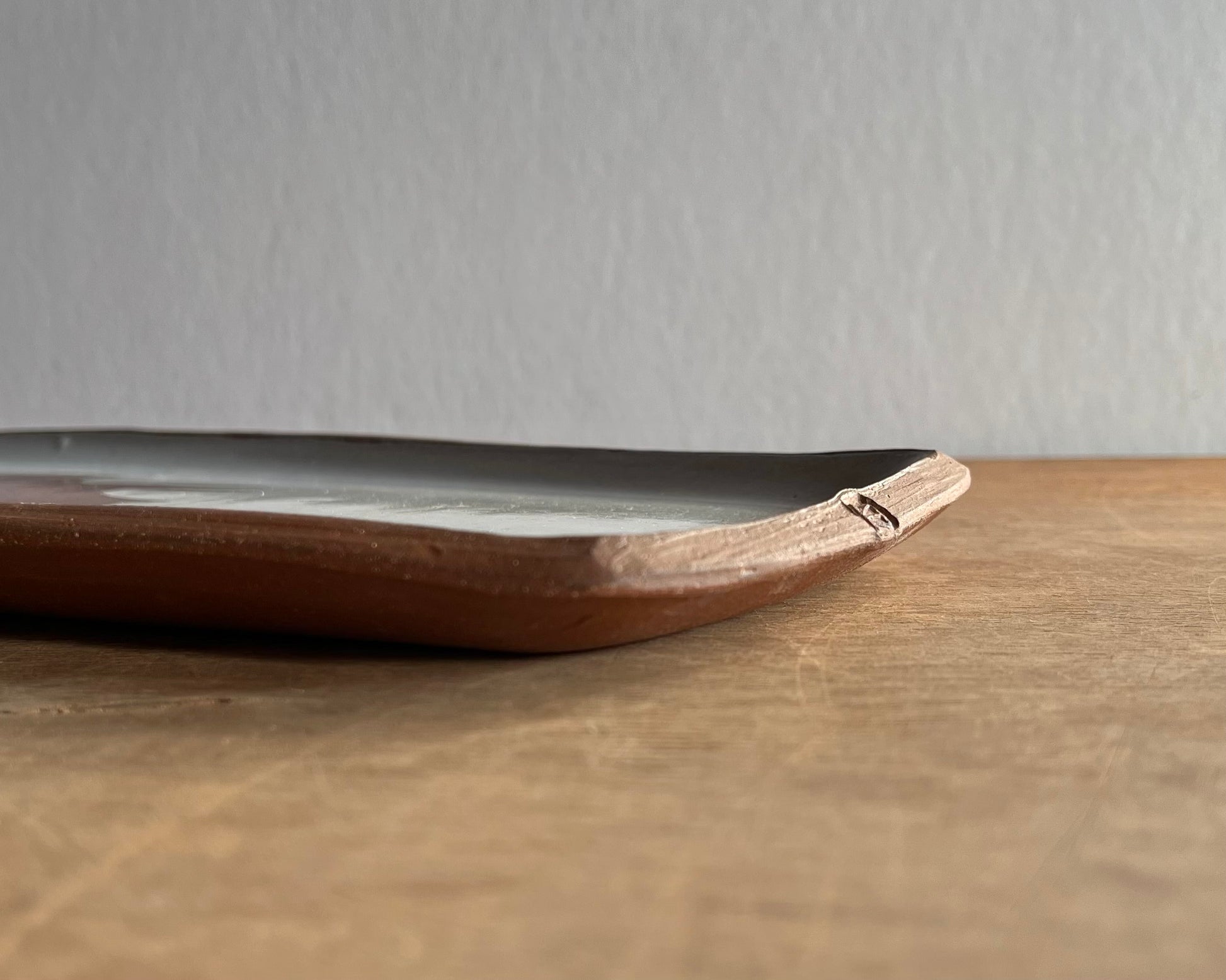 This plate is approximately 12"x5.75"x0.5" and was fired to over 2100F. It is food, microwave and dishwasher safe.