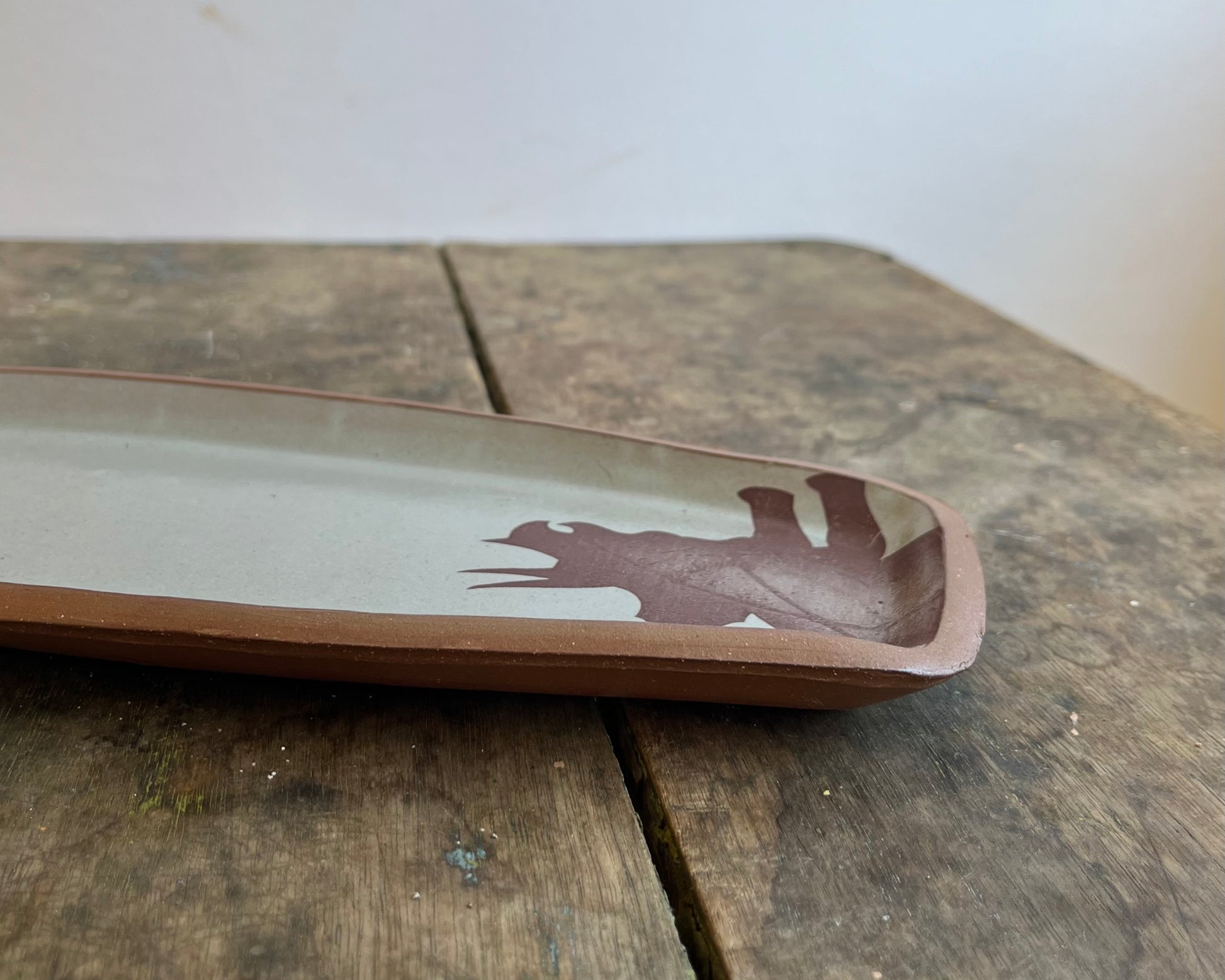 This plate is approximately 10.5"x4.5"x0.5" and was fired to over 2100F. It is food, microwave and dishwasher safe.