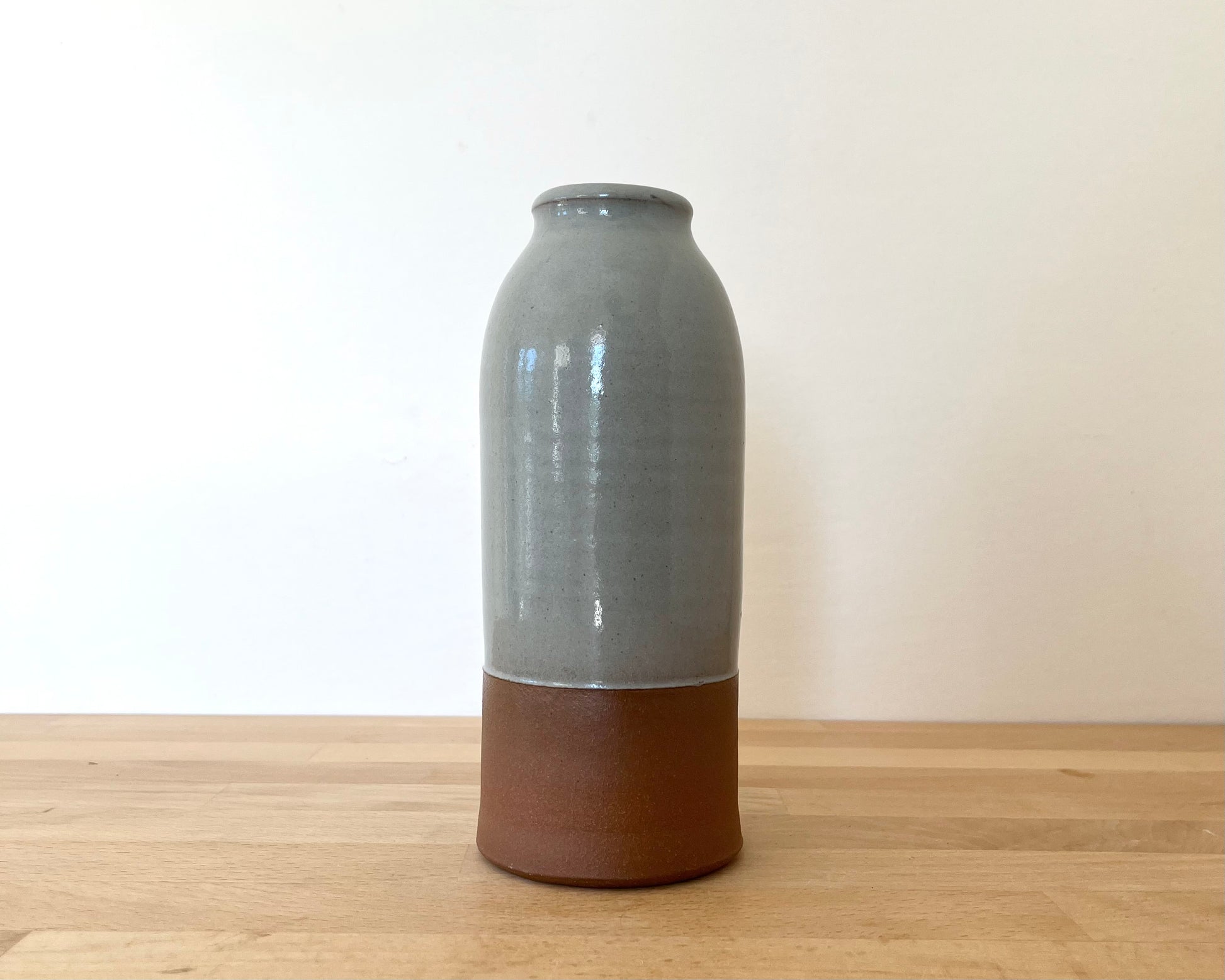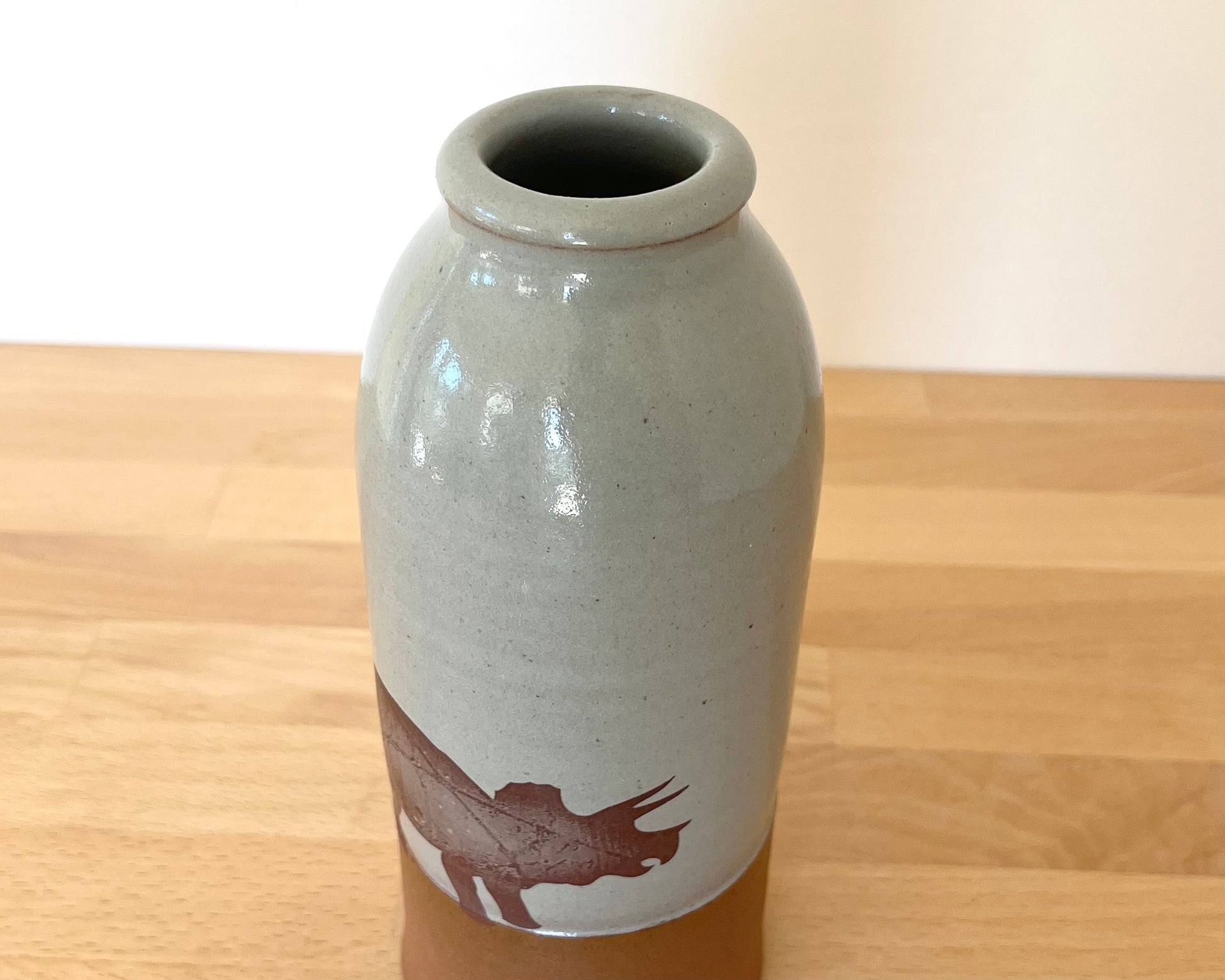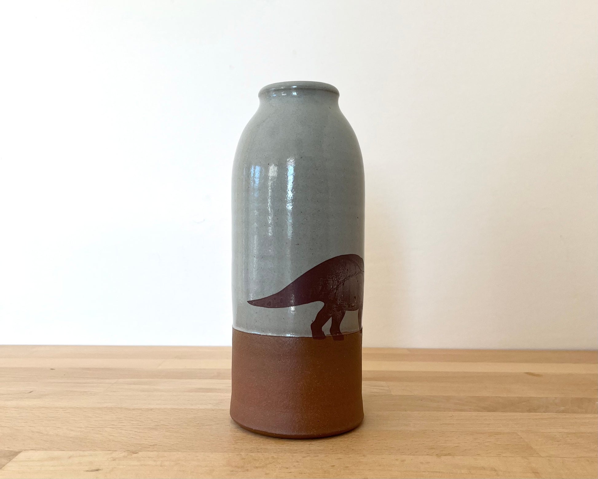 This handmade, wheel thrown vase has blue glaze and a triceratops design that has been fired onto the glaze. The bottom section is left unglazed, and the matte raw red clay complements the smooth glazed surface of the top and interior of the vase.