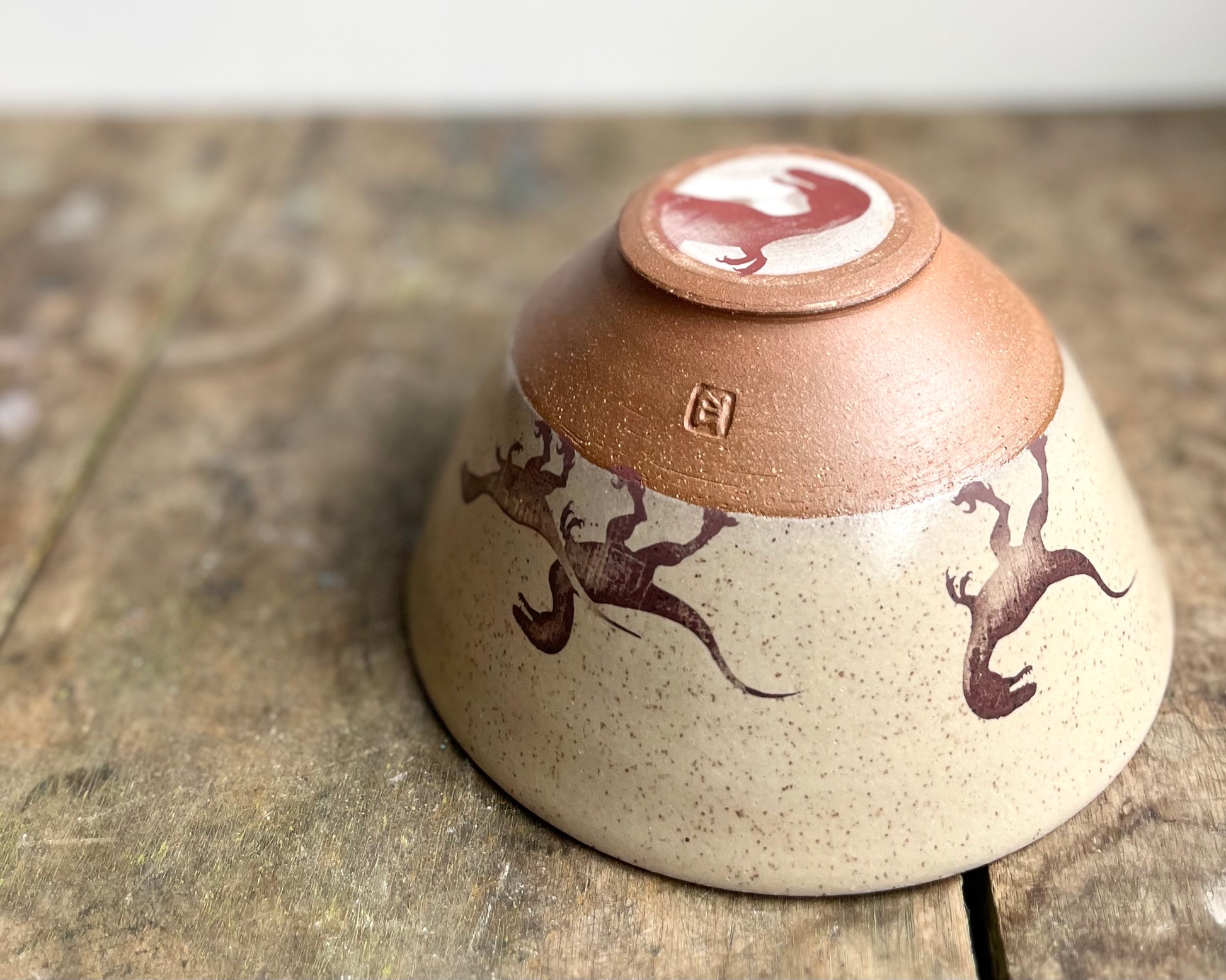 This handmade, wheel thrown bowl has yellow glaze and a velociraptor pack design that has been fired into the glaze. The bottom section is left unglazed, and the matte raw red clay complements the smooth glazed surface of the top and interior of the bowl. It also has a velociraptor head on the bottom of the bowl.