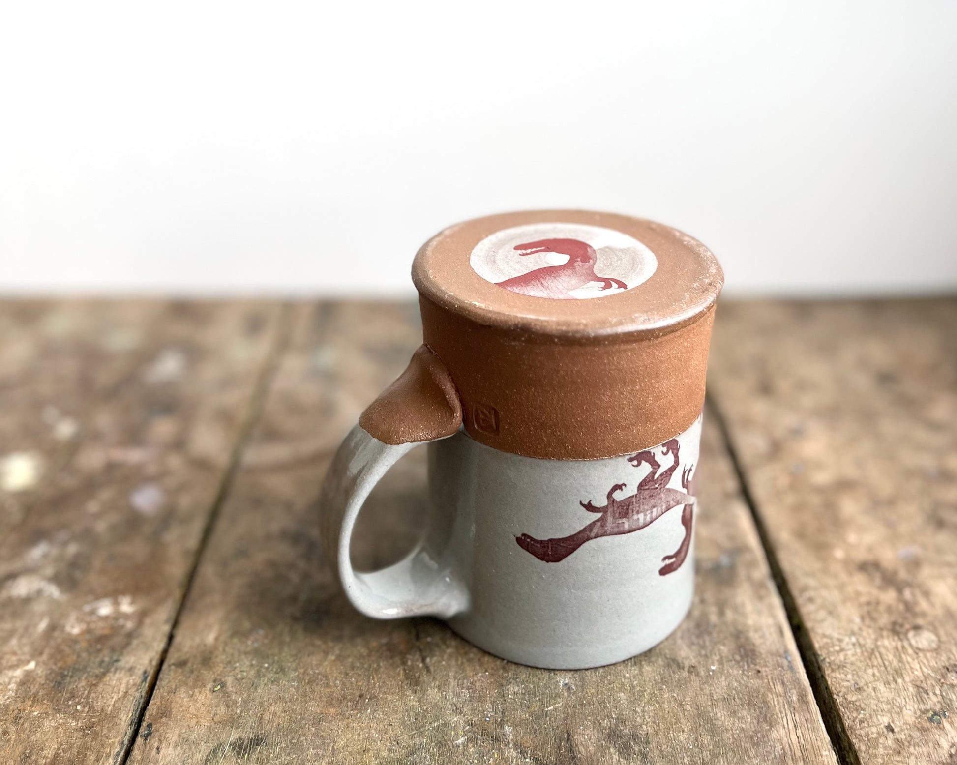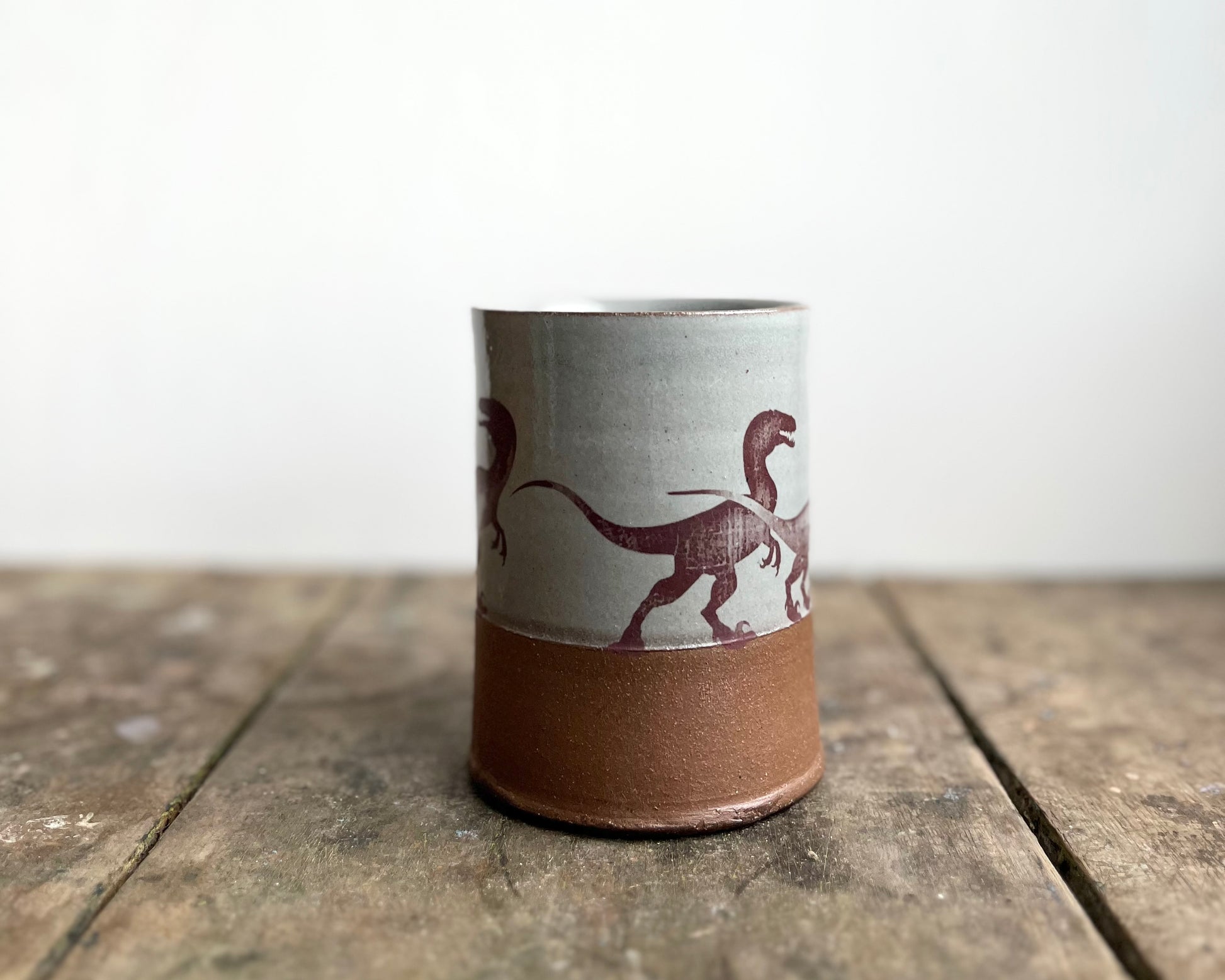 This handmade, wheel thrown mug has blue glaze and a pack of three velociraptors that have been fired into the glaze. The bottom section is left unglazed, and the matte raw red clay complements the smooth glazed surface of the top and interior of the mug. It also has a velociraptor head on the bottom of the mug.