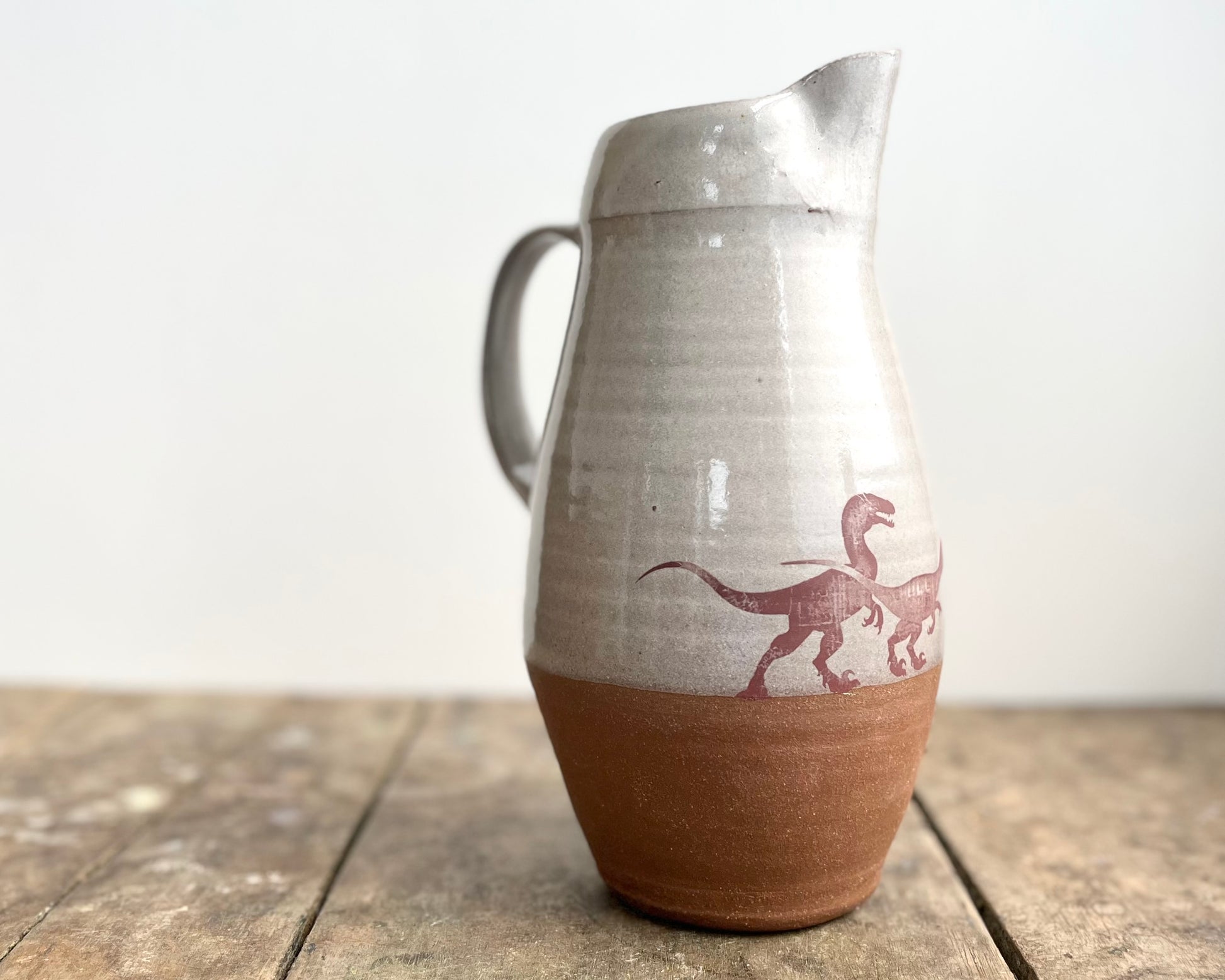 This handmade, wheel thrown vase has white glaze and a triceratops design that has been fired onto the glaze. The bottom section is left unglazed, and the matte raw red clay complements the smooth glazed surface of the top and interior of the vase.